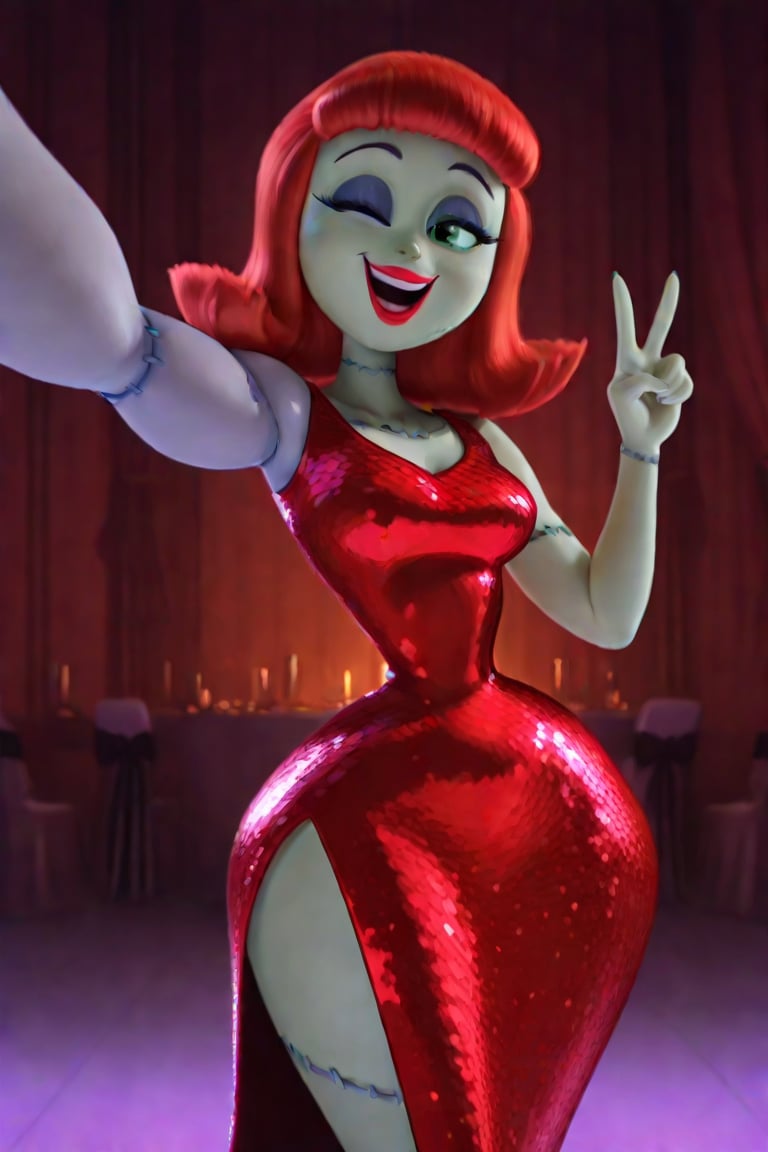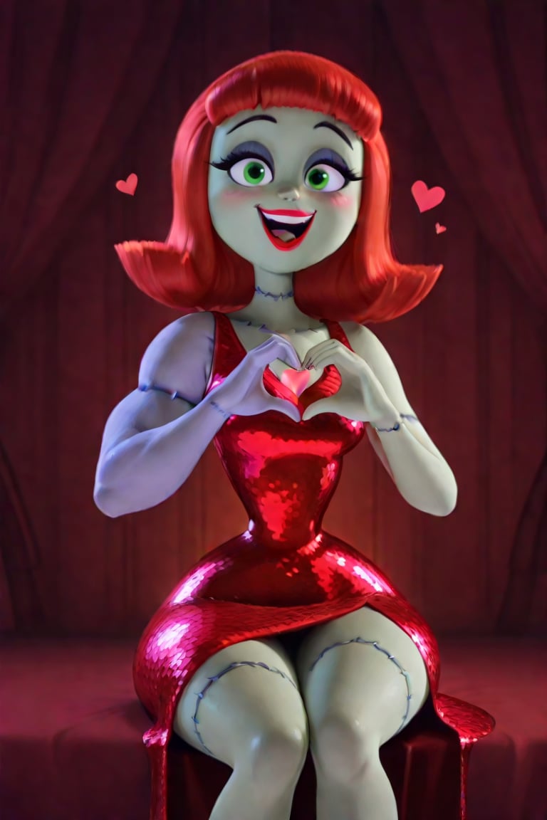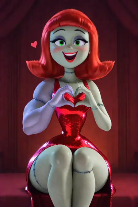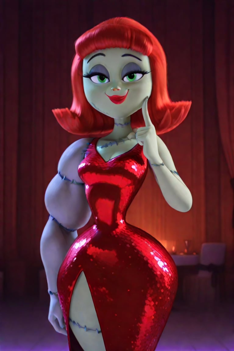 연한 녹색 피부, 밝은 빨간색 단발머리(곱슬), 빨간 립스틱, 녹색 눈, 몸에 보이는 바늘땀, 봉합된 다리, 허리와 엉덩이가 뚜렷한 골반 비율, 밝은 보라색으로 색이 다르고 극단적으로 큰 근육질의 왼팔, 큰 왼팔, 넓은 엉덩이, 인상적인 보라색 아이섀도, 봉합된 이음새, 흰색 털 스털, 다리가 크게 벌어진 반짝이는 빨간 피팅 드레스, 빨간 힐