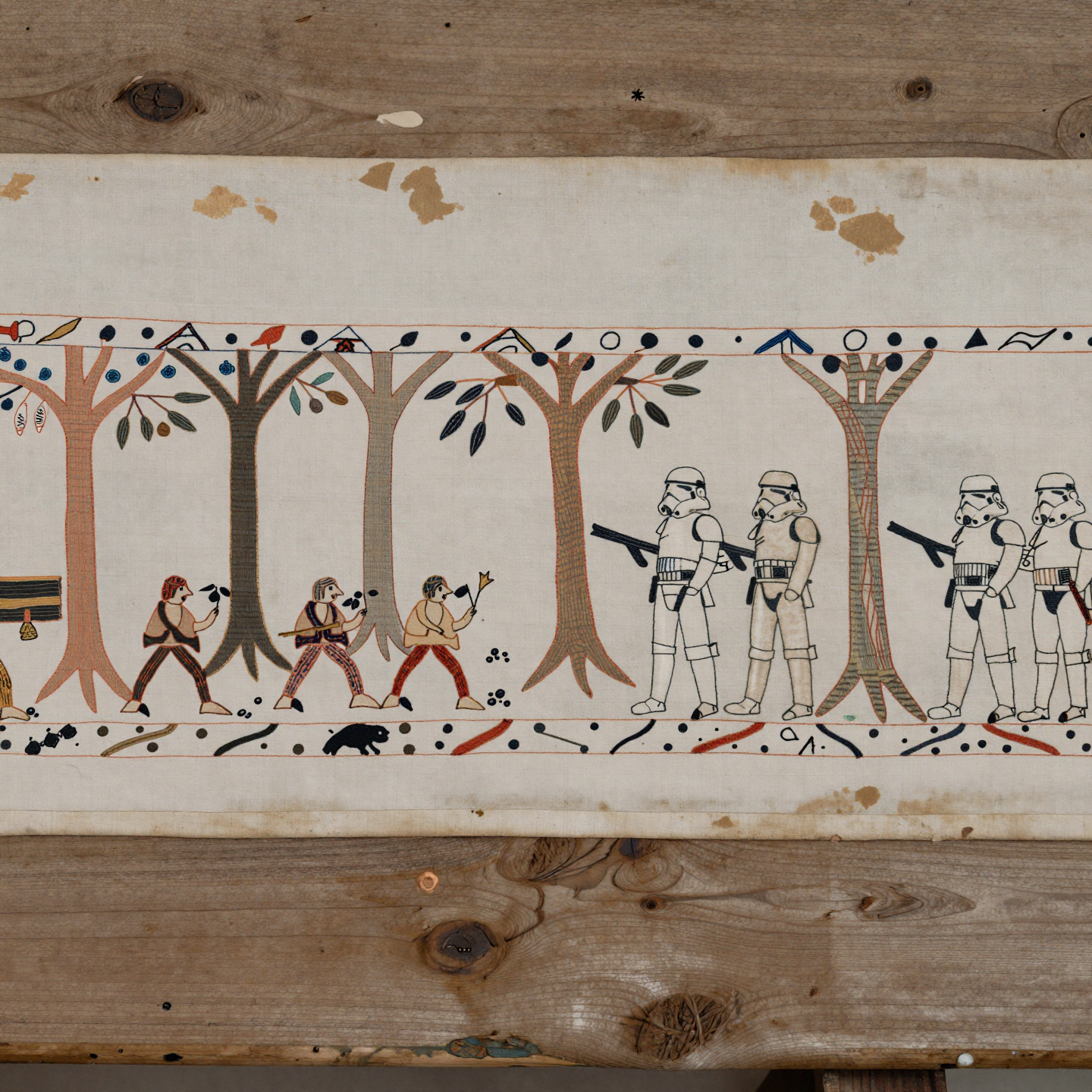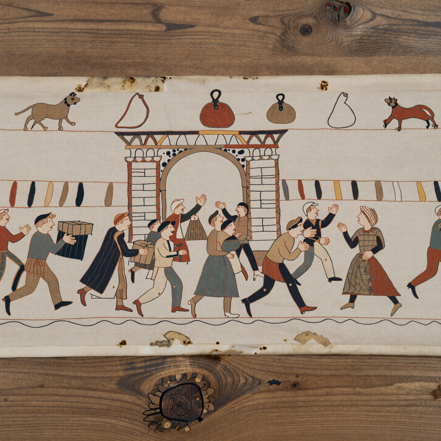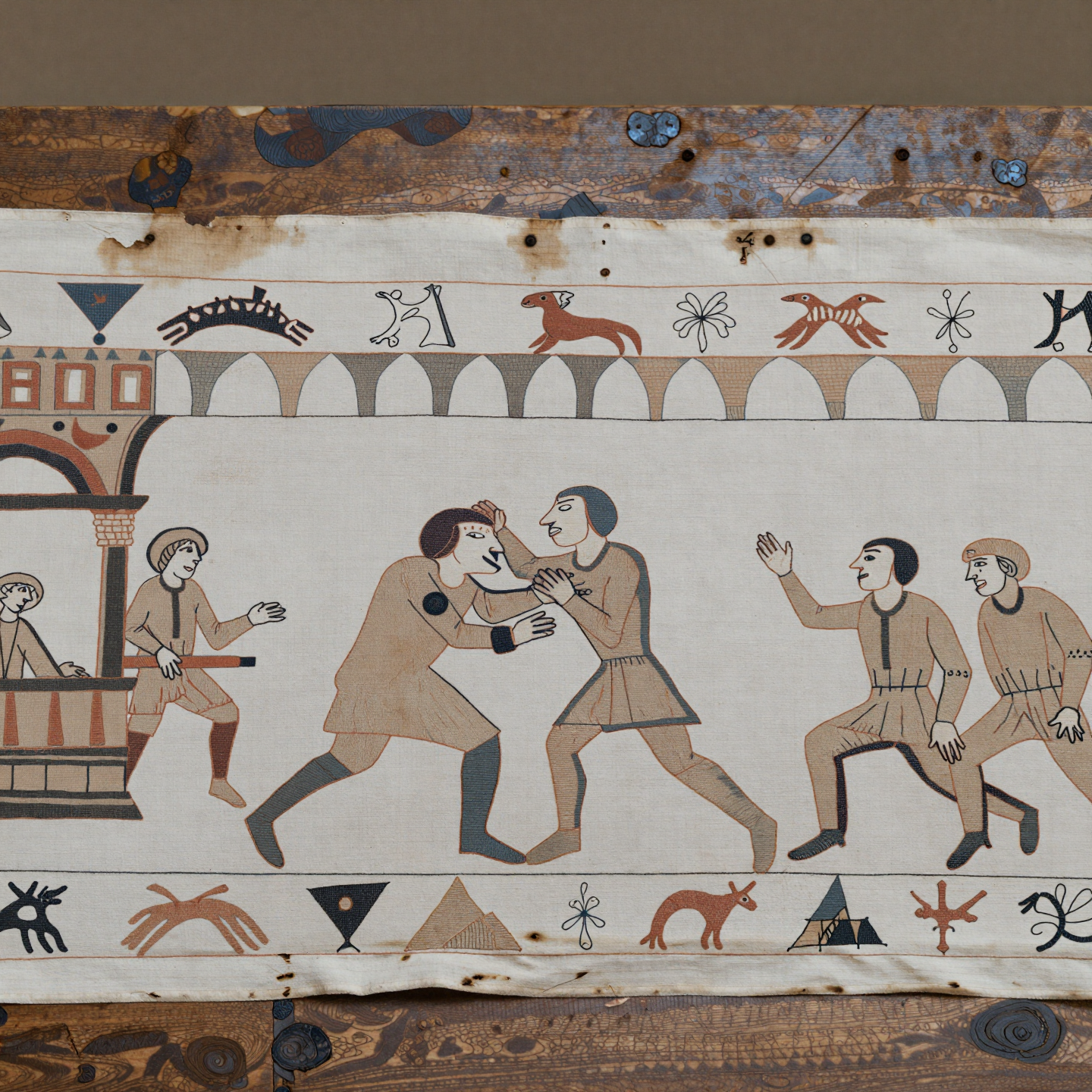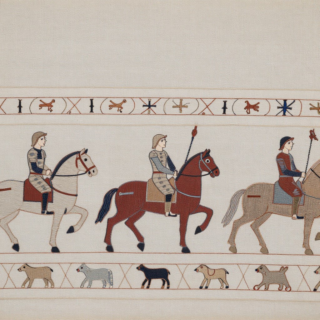 ベイユーのタペストリーは、11世紀に作られた約70メートルに及ぶ巨大な刺繍布で、1066年のノルマン征服、特にハスティンズの戦いを描いており、ロマネスク芸術および中世史における重要な作品とされている。征服直後にイングランドで制作され、おそらくオド大司教(征服王ウィリアムの異母兄弟)によって作られたとされるこのタペストリーは、芸術的傑作であると同時に歴史的記録としても機能し、1064年から戦いに至るまでの出来事をノルマン側の視点で、ラテン語の銘文、人物、寓話が描かれた精緻な縁取りとともに示している。