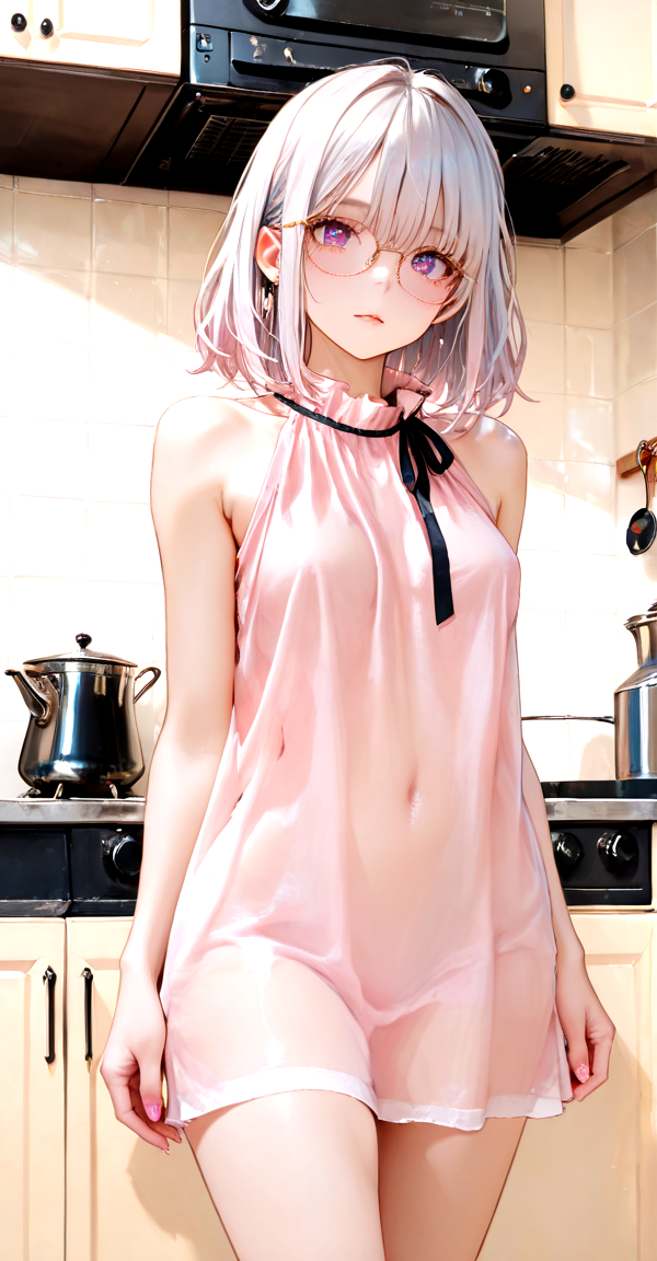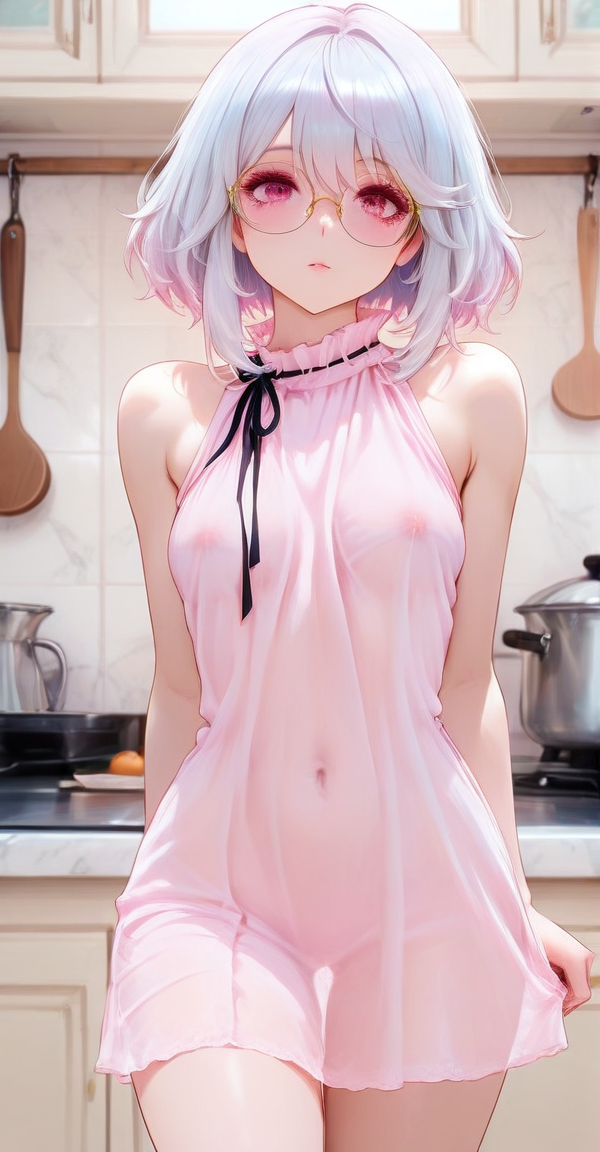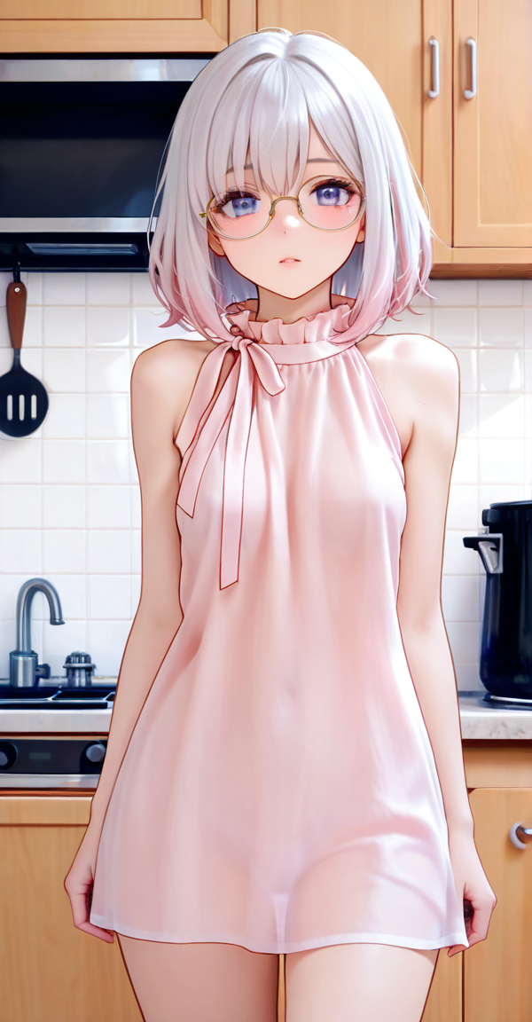 xg1, round gold-rimmed glasses, light pink sleeveless chiffon blouse with ruffled high neck and ribbon bow tie, soft translucent fabric