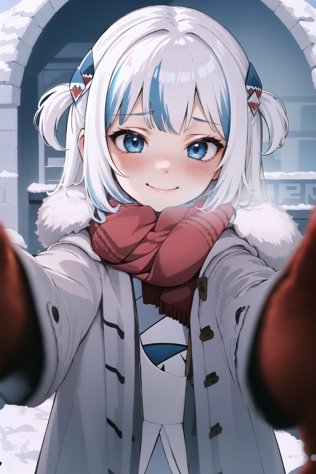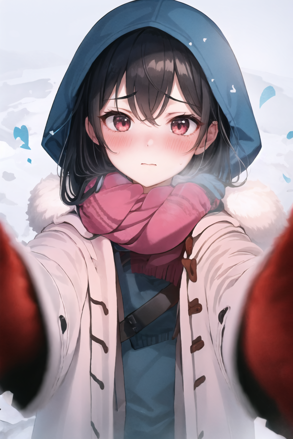 red scarf, winter clothes, smile, blush
