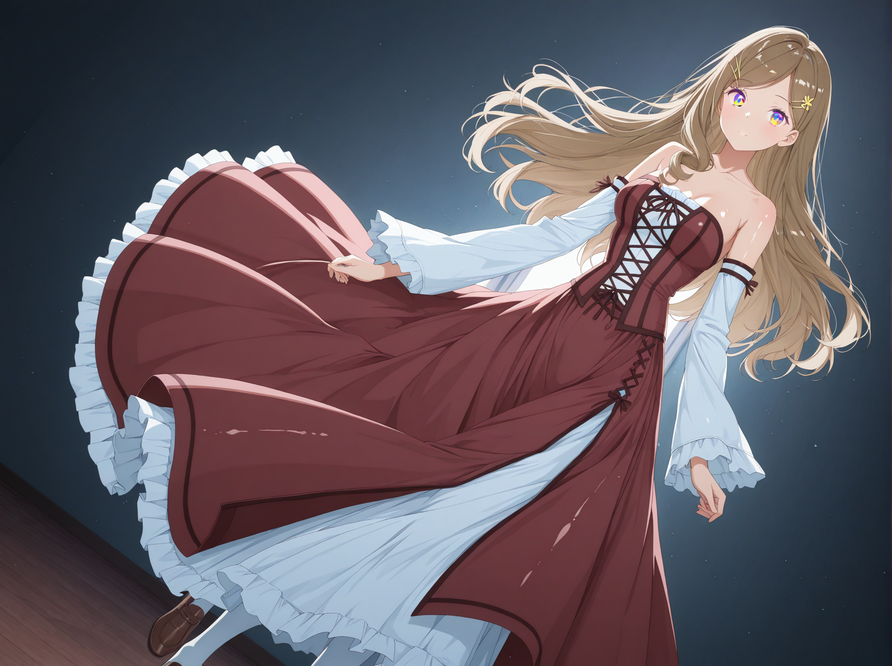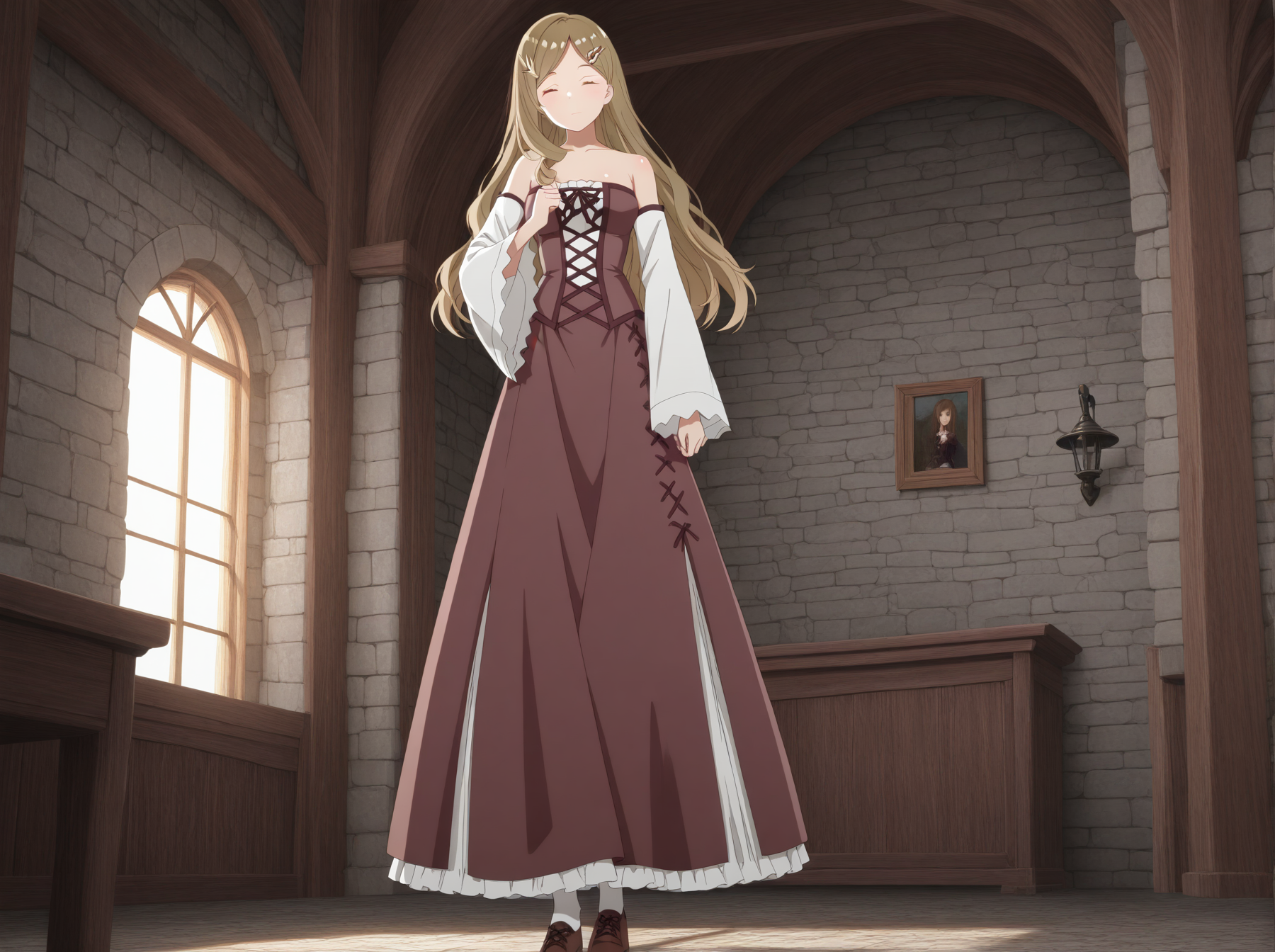 옷: (어깨 드레스, 갈색 드레스, 흰색 슬릿, 긴 드레스, 분리된 소매, 넓은 소매, 어깨 노출, 흰색 팬티스타킹, 갈색 신발)