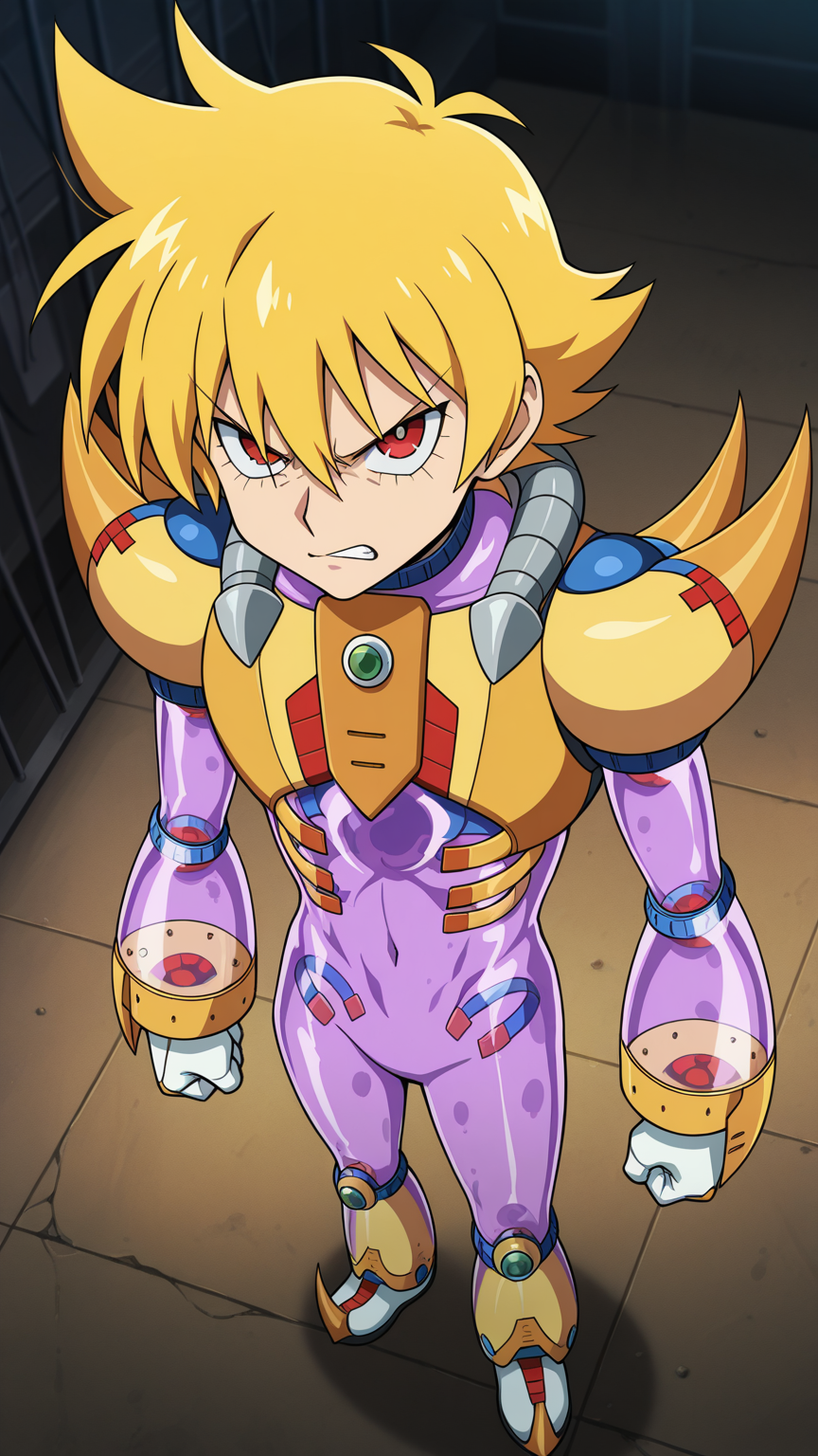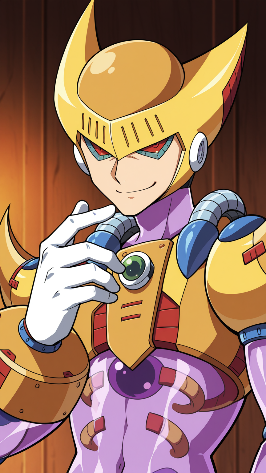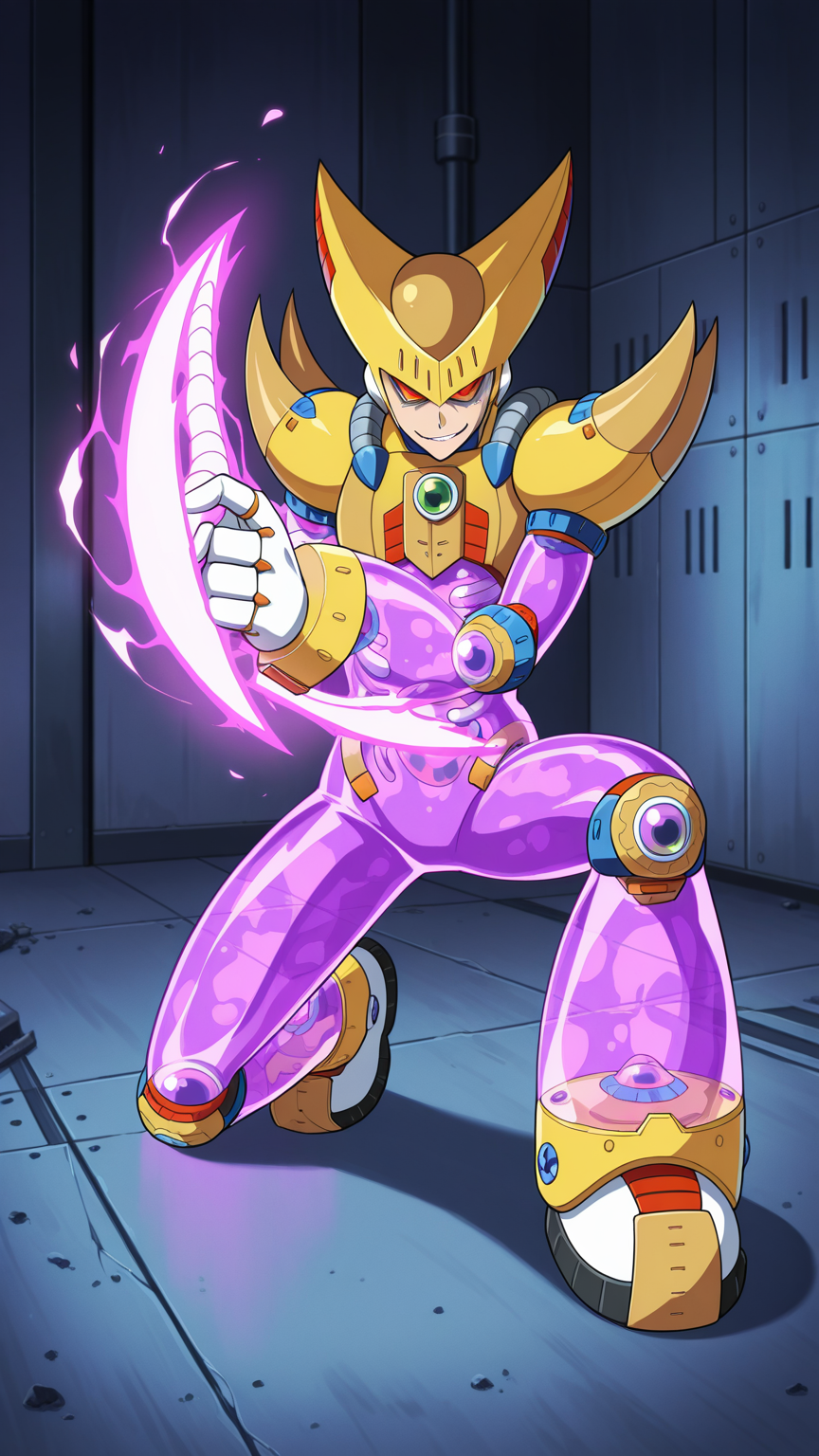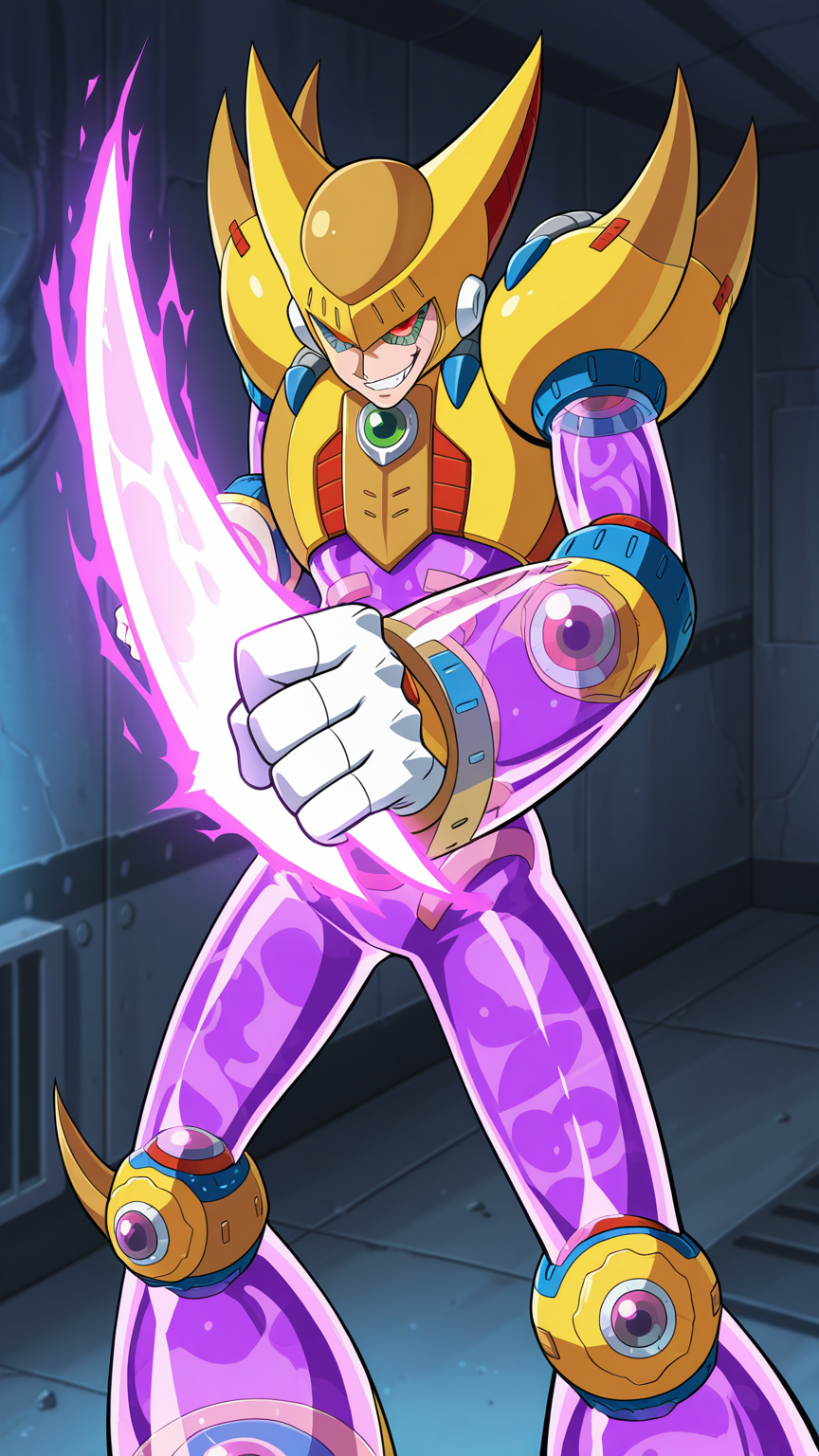 Double, Reploid, Purple Transparent Body, Helmet, Spikes, Yellow Armour, Red Eyes, White Gloves, White boots