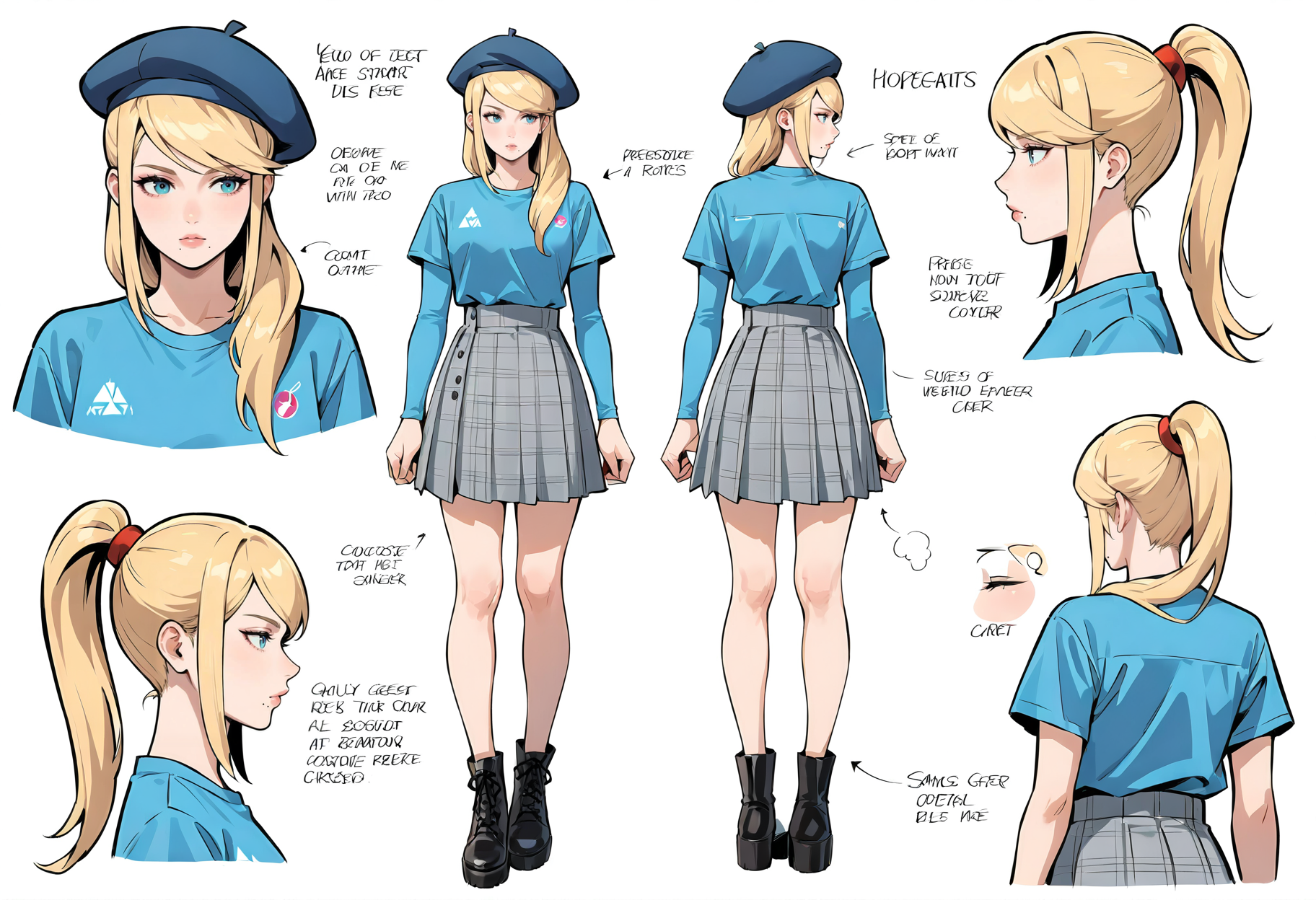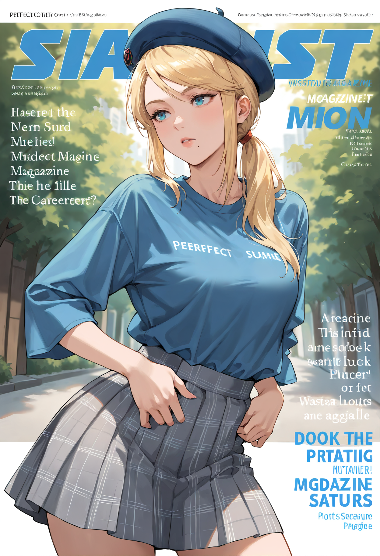 어깨에 걸친 머리카락,치마,모자,셔츠,베레모,체크 치마,대체 복장,파란 셔츠,파란 머리장식,캐주얼,긴 소매,짧은 소매,주름 치마,회색 치마