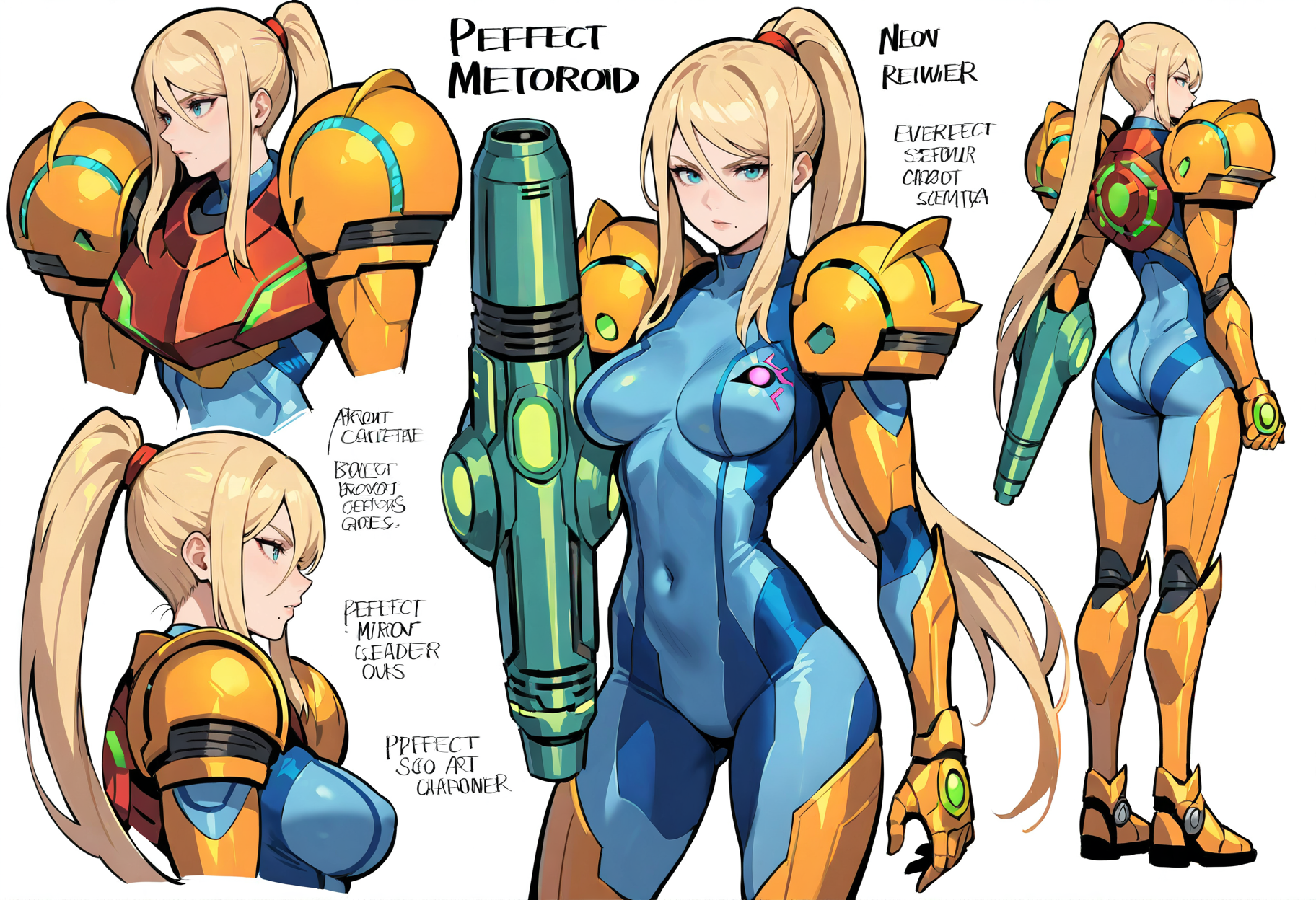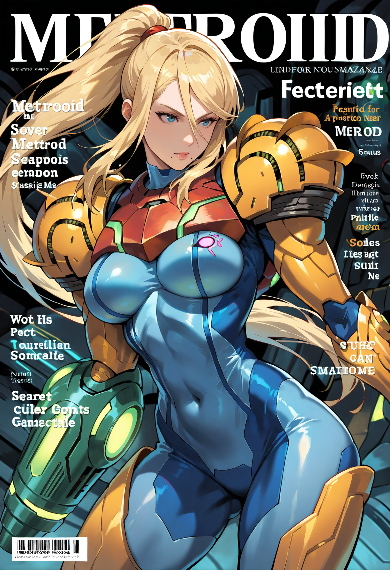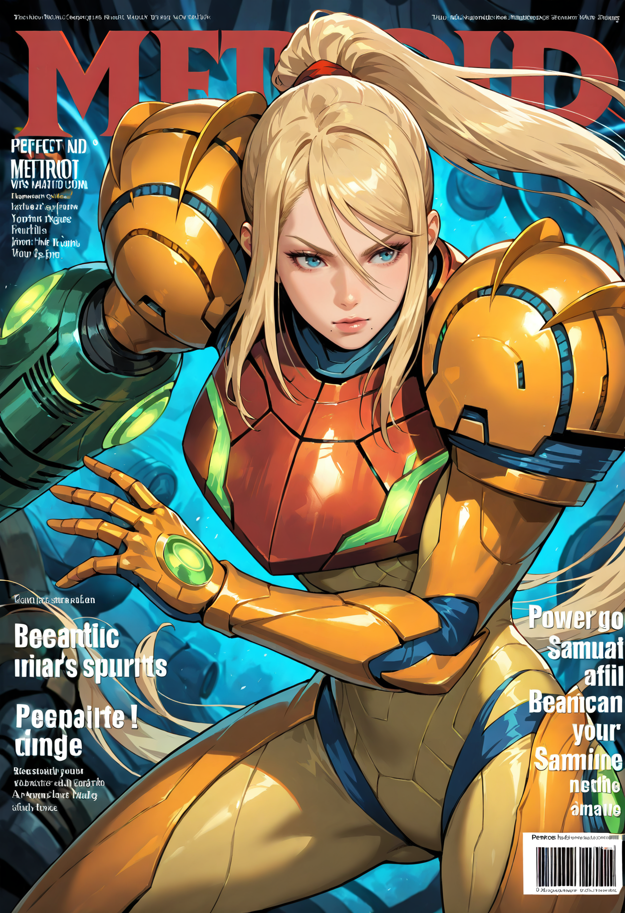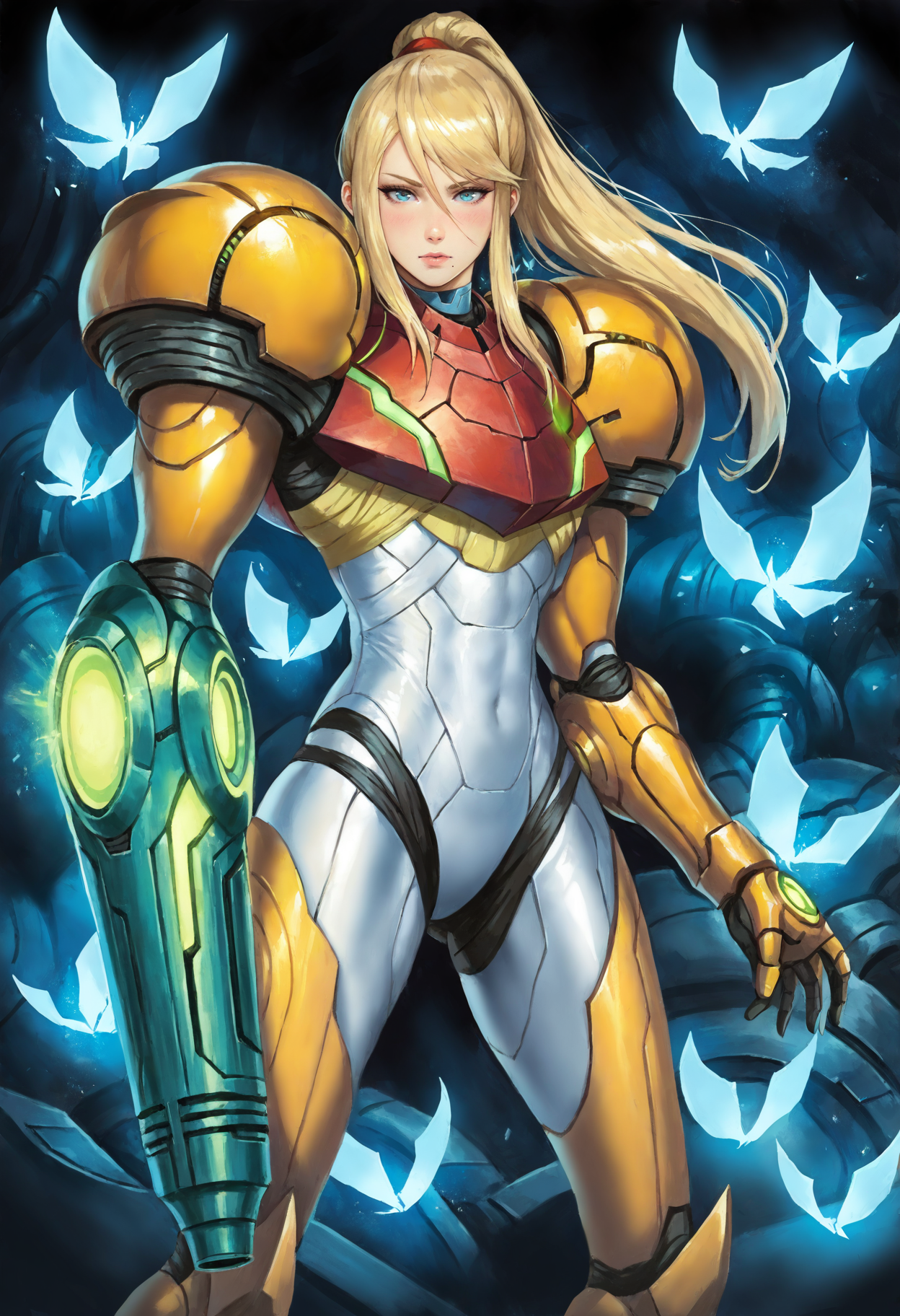 Samus_PA,1girl,눈 사이 머리카락,점,입 밑 점,파란 눈,금발,긴 머리,매우 긴 머리,풀터지기,앞머리,측면 머리카락,파워 수트(메트로이드),팔 캐논,파워 수트,갑옷,파워 아머,입술,헬멧,가슴,바디수트