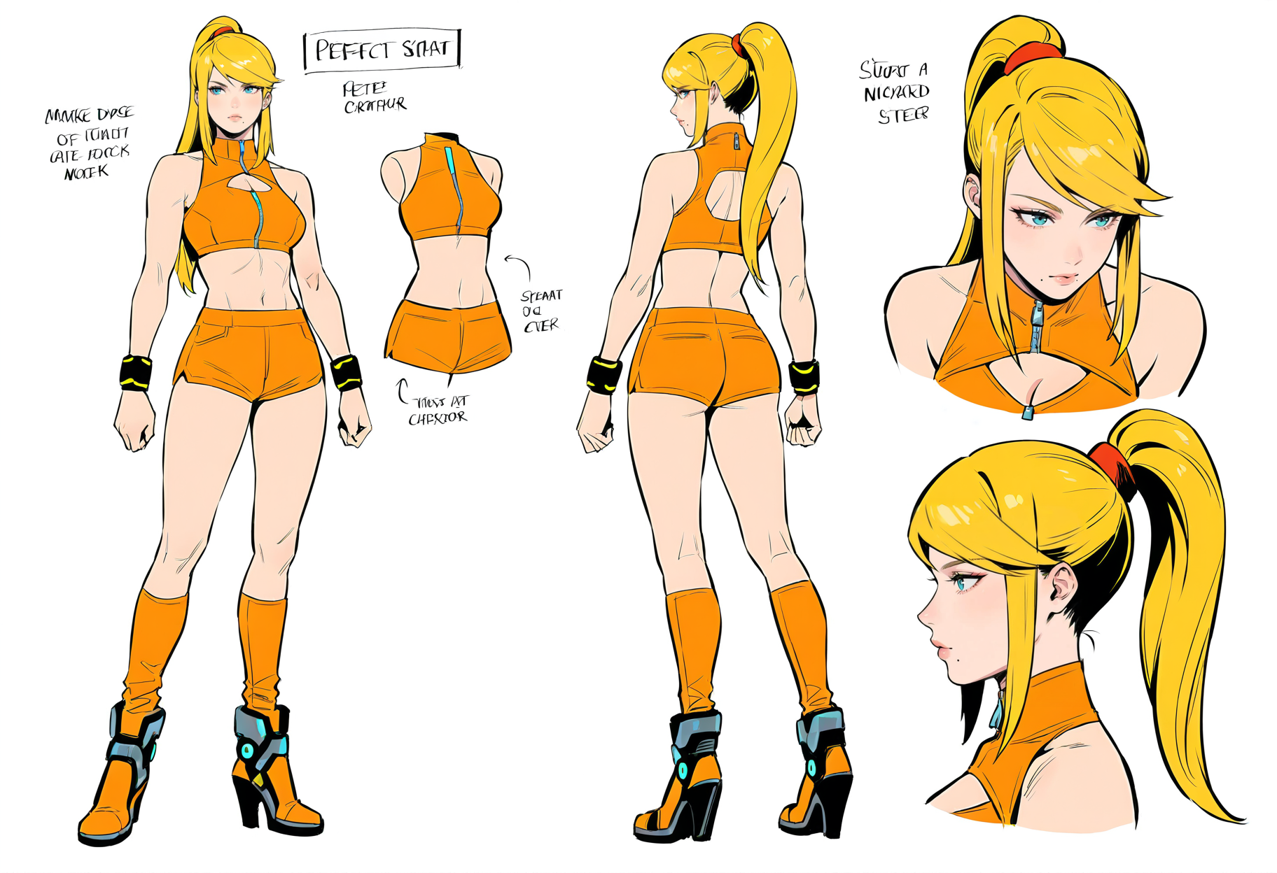 반바지,크롭탑,하이힐,허리,부츠,하이힐 부츠,팔찌,어깨 노출,터틀넥,짧은 반바지,할터넥,가슴,소매 없음,스쿠نش,주황색 반바지,중간 크기 가슴,팔찌,주황색 셔츠,보석,스포츠 브라,네온 트림,주황색 신발,대체 복장,무릎 부츠,신발,셔츠,지퍼,가슴 노출,양말,의상 노출