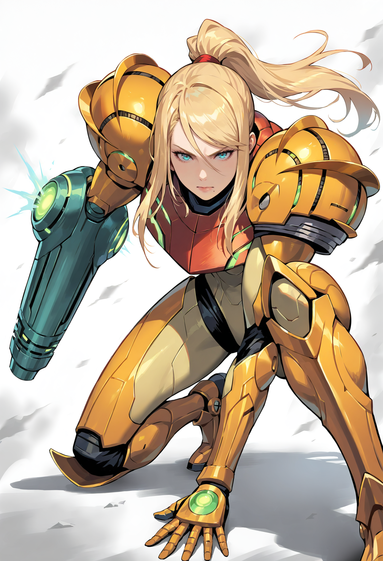 Samus_FA,1girl,얼굴 가림,눈 가림,파워 수트(메트로이드),팔 캐논,파워 아머,헬멧,갑옷,전신 갑옷,빛나는,과학 소설,네온 트림