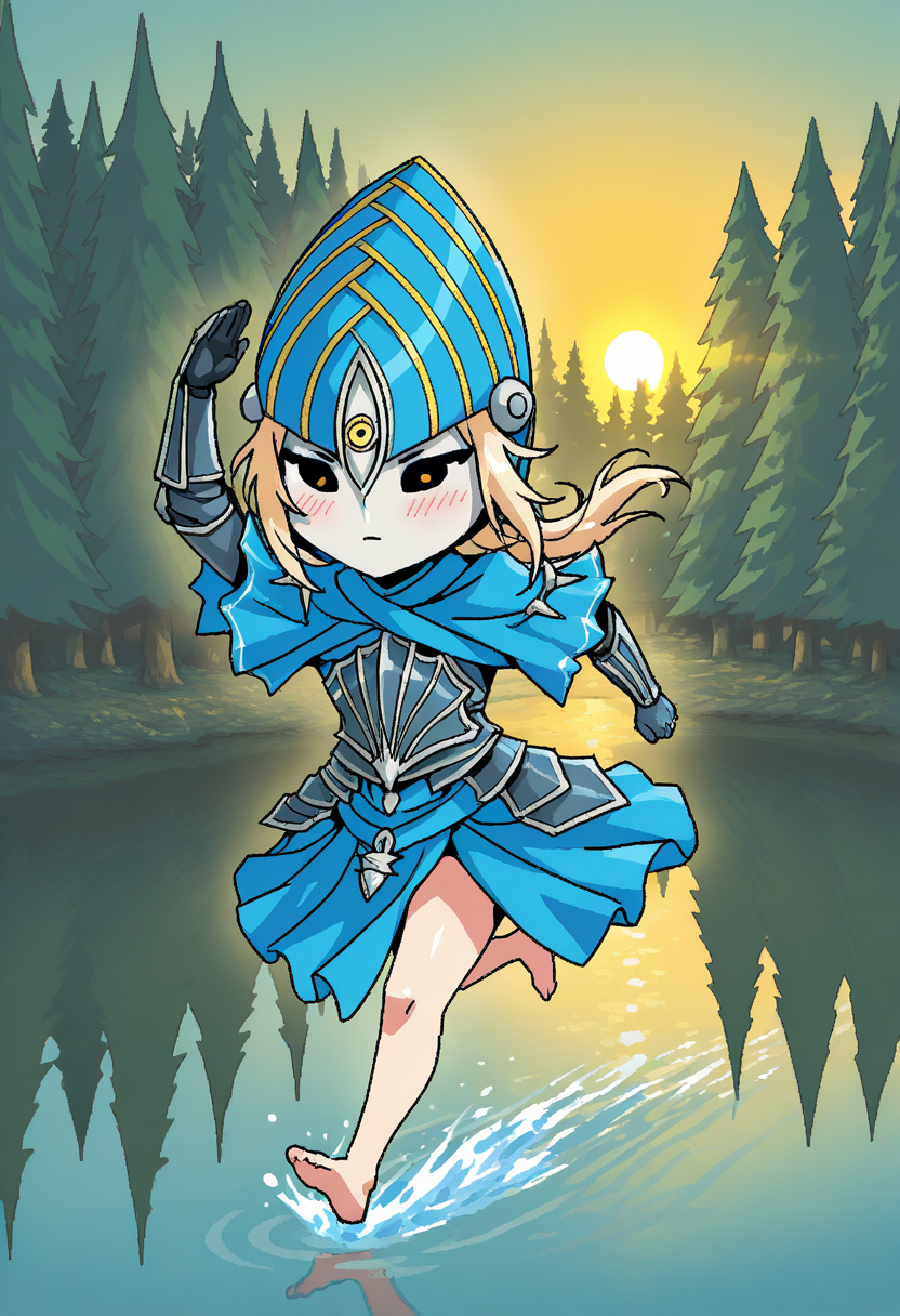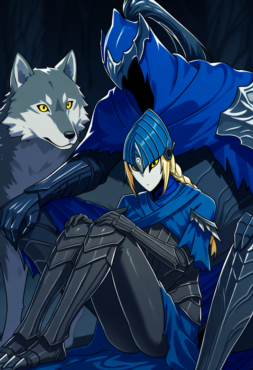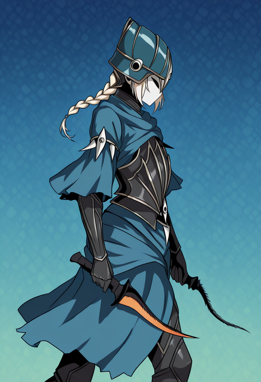 アーマードドレス、カペレット、肩の突起、青いローブ、黒いアーマー、ガントレット