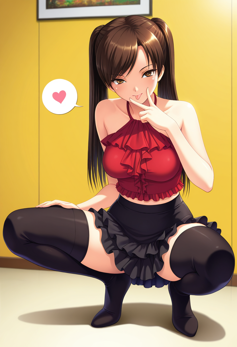 • カジュアル、ハーネック、クロップトップ、赤いシャツ、フリル付きシャツ、ノースリーブシャツ、黒いスカート、フリル付きスカート、レイヤードスカート、ミニスカート、絶対領域、黒いタイツ