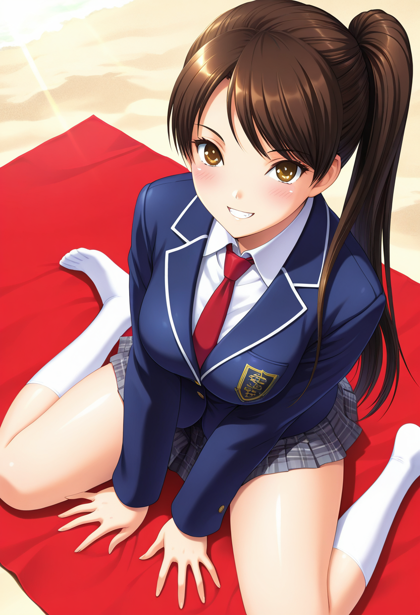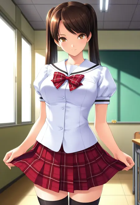 • 学校制服。白いセーラー襟、赤いリボン、チェック柄リボン、白いセーラー服、ふんわりした短い袖、チェック柄スカート、赤いスカート、プリーツスカート、ミニスカート、絶対領域、黒いタイツ、ローファー