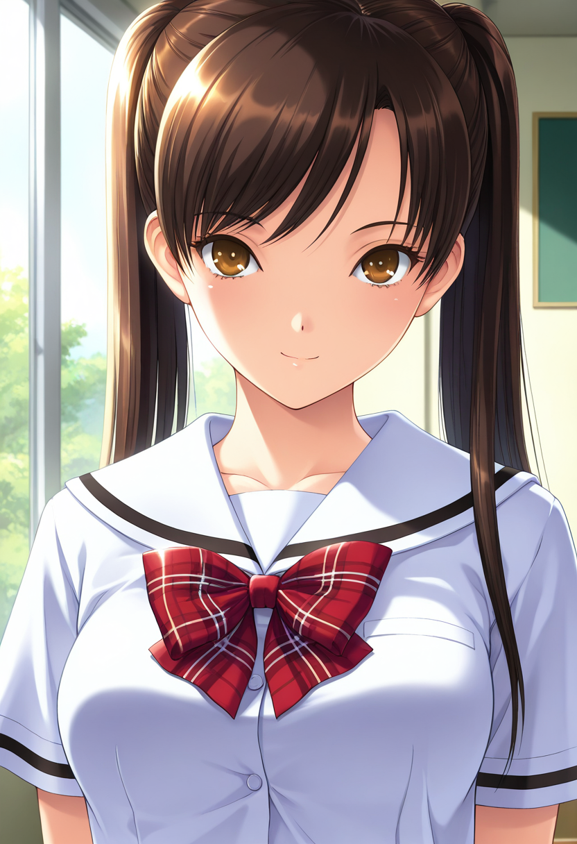 • manamiww, brown eyes, brown hair, long hair, parted bangs, swept bangs, twintails, straight hair, medium breasts,