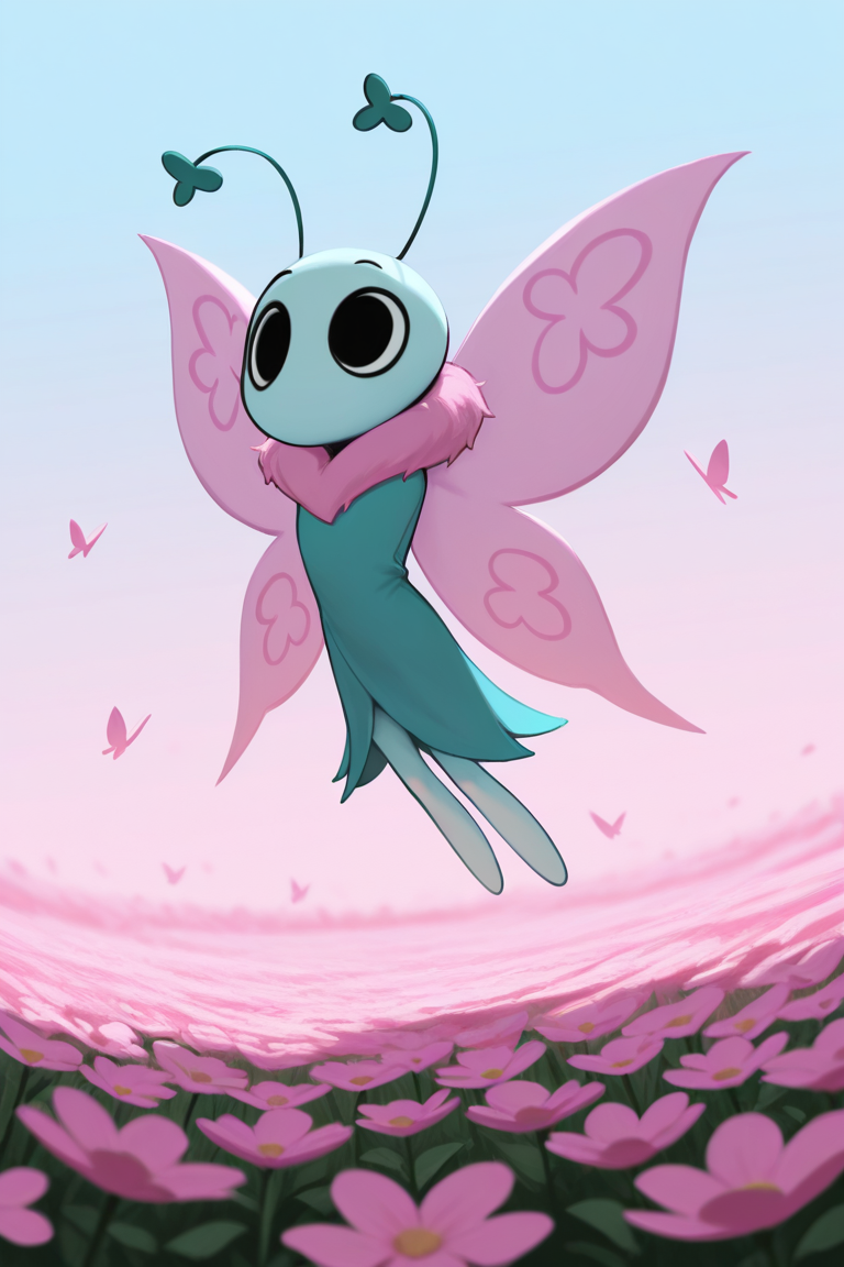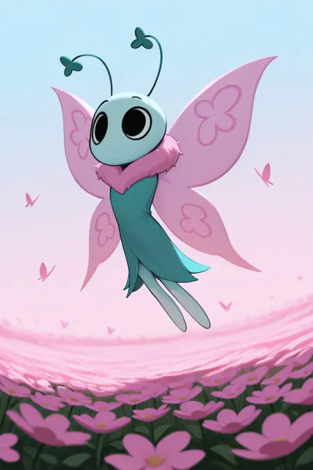 Useful tags:flytedw, light blue skin, pink neck fur, pink butterfly wings, no mouth, turquoise bug antennae, turquoise dress, no arms, black eyes