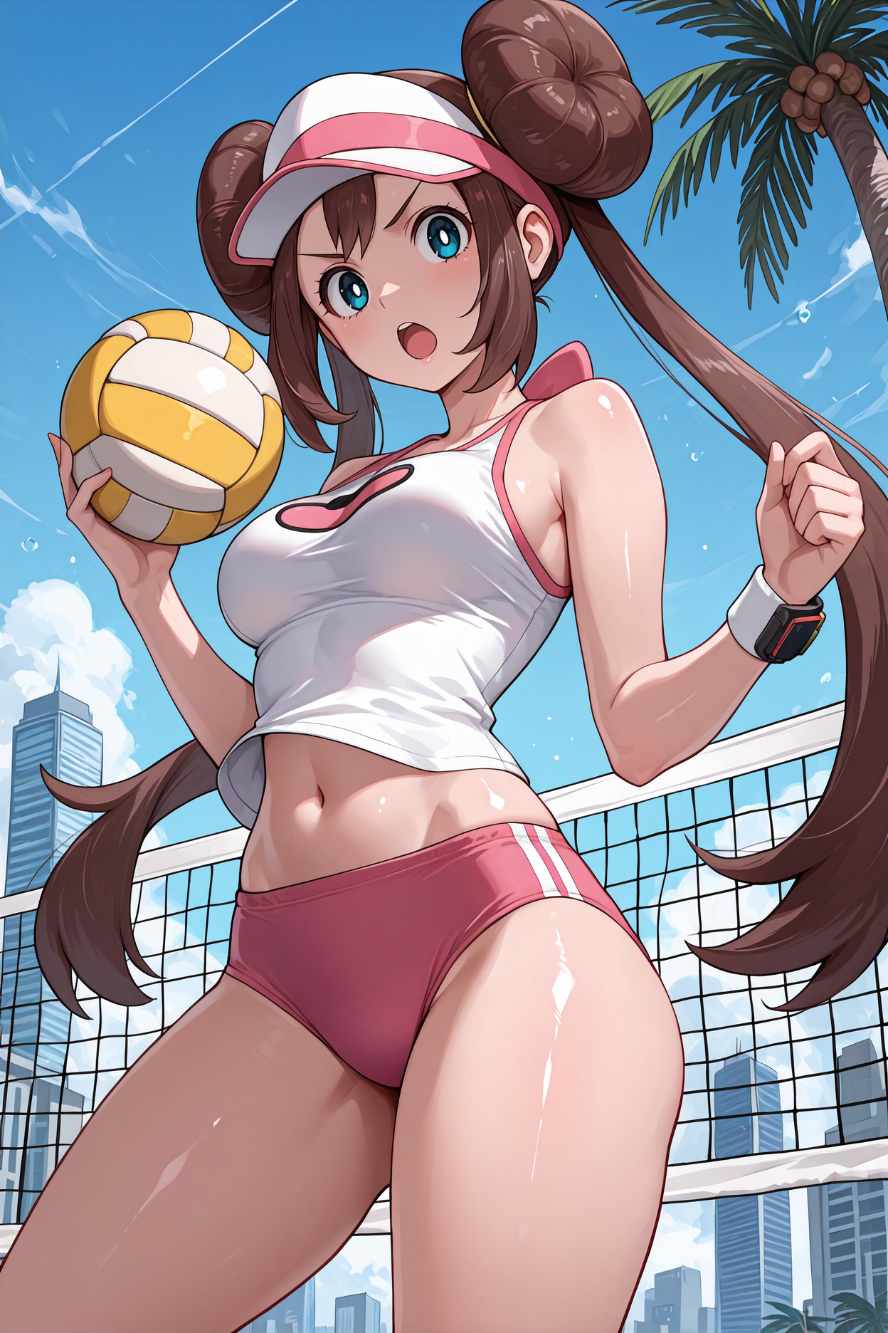 1. rosa (pokemon), 青い目, 茶色の髪, 長い髪, ツインバング, バング, ドーナツバング