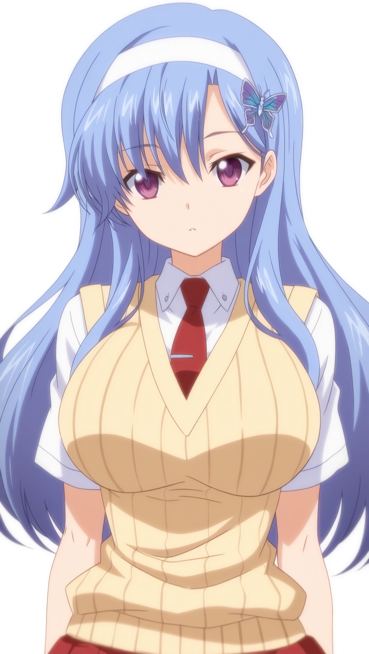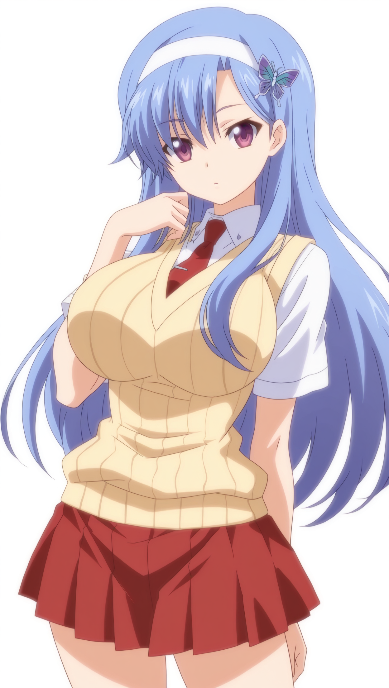 anime coloring, masterpiece, best quality, amazing quality, n4n4s3r1r1n4, 1girl, long hair, blue hair, purple eyes, large breasts, hairband, white hairband, butterfly hair ornament, collared shirt, white shirt, shirt, necktie, sweater vest, short sleeves, skirt, red skirt, pleated skirt, solo, pose, standing, looking at viewer, from front, ((((white background, simple background))))