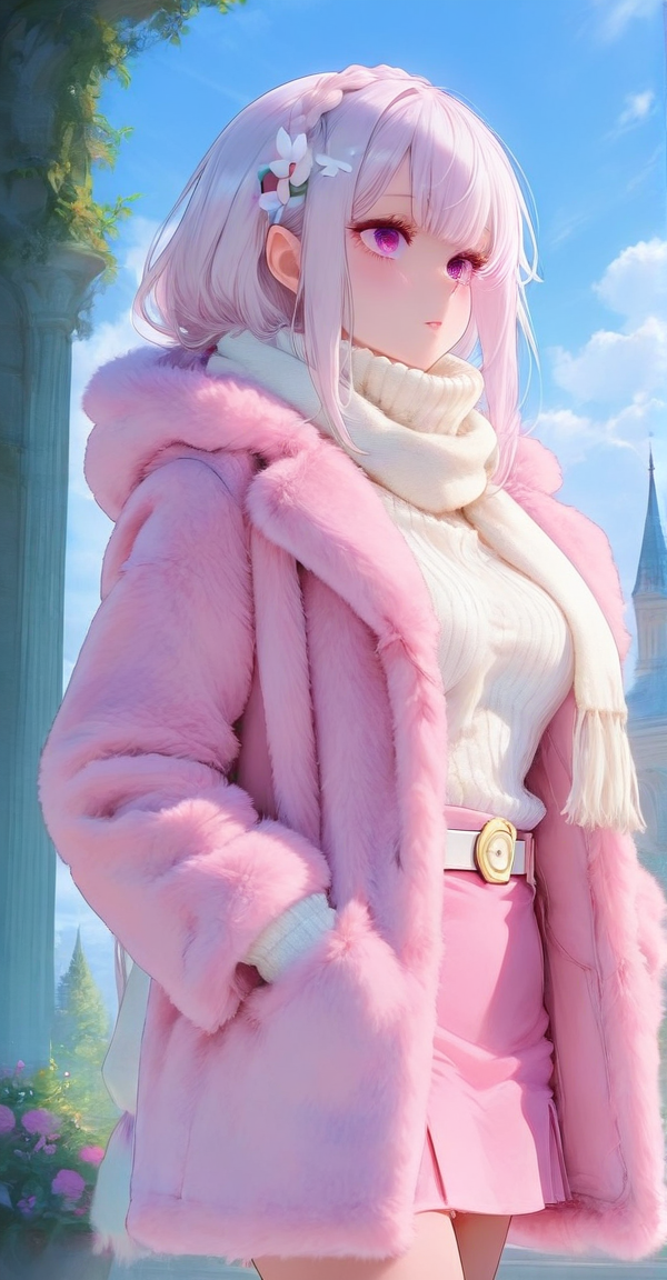 xg1,pink faux fur teddy coat open front, cream knitted turtleneck sweater, long white knit scarf with fringes, pink mini skirt and white belt and gold buckle, light gray knit gloves