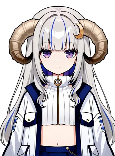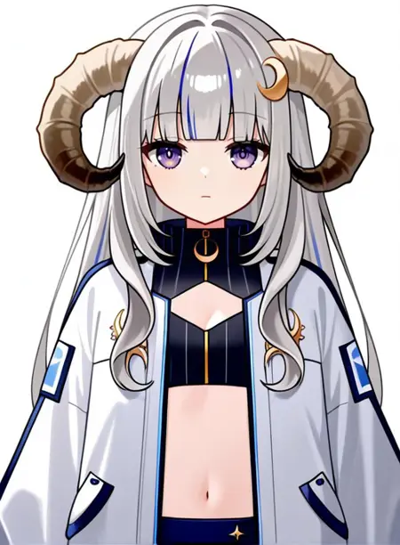 AuroraAtria,乳房,发饰,蓝色头发,紫色眼睛,灰色头发,多色头发,小乳房,角,虚拟YouTuber,齐刘海,星星(符号),双色头发,挑染头发,头发内收,弯曲的角,新月形发饰,羊角,棕色角,长发,星星发饰