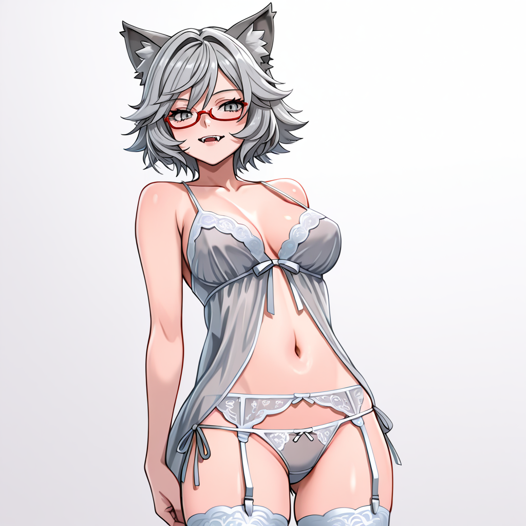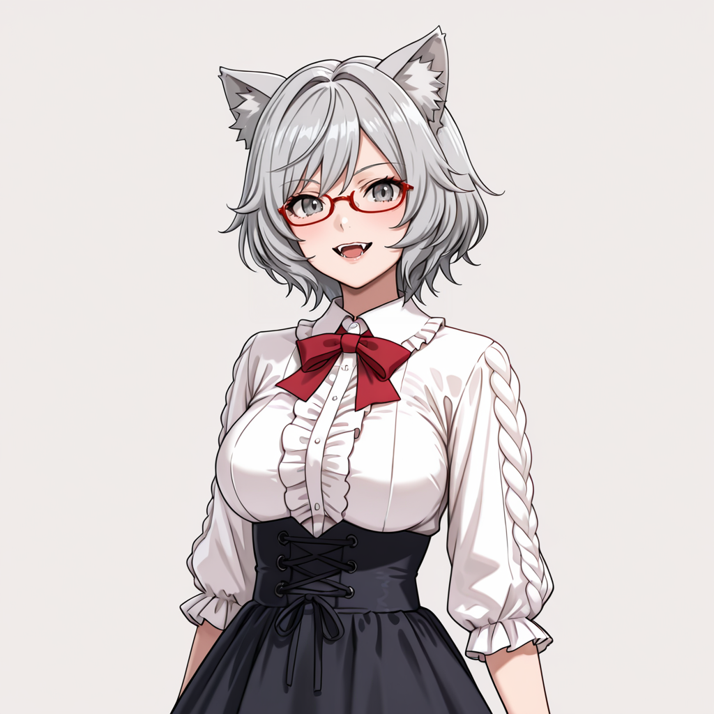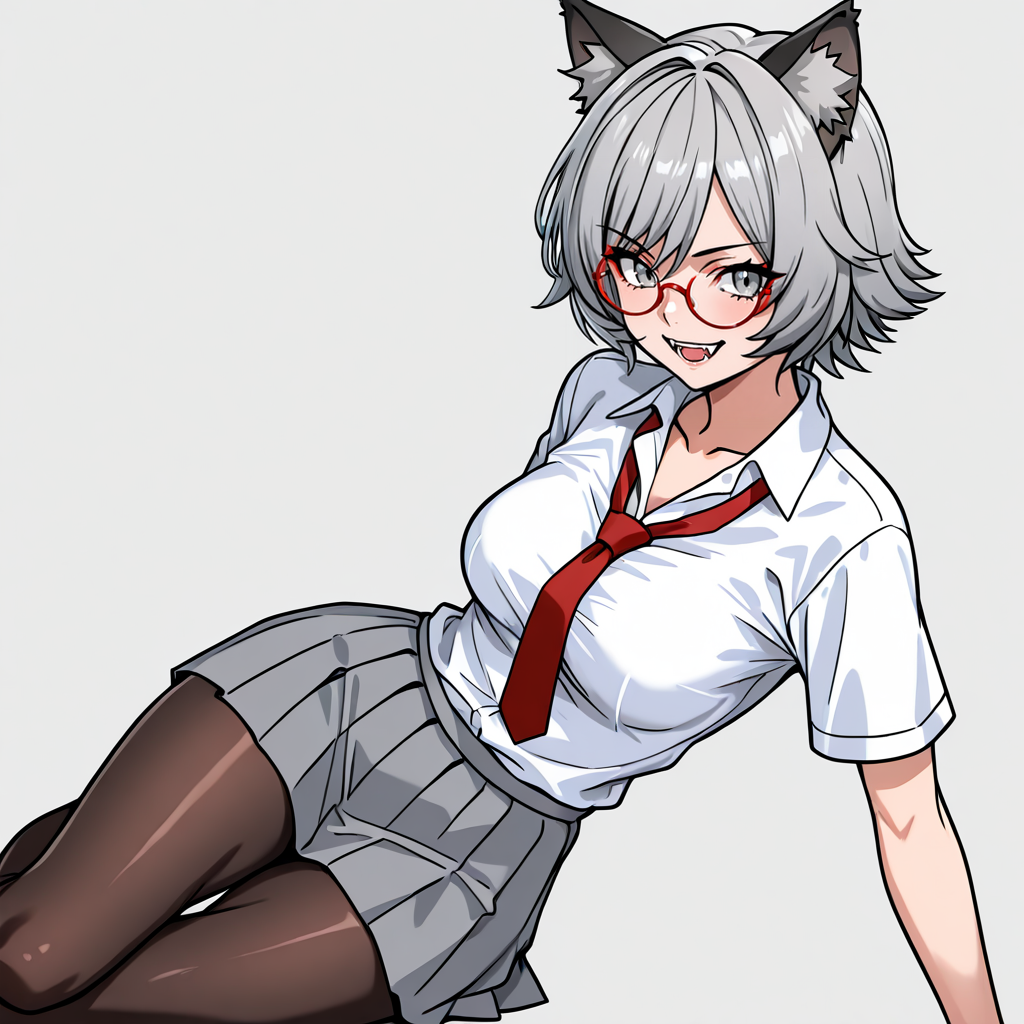 • トリガー: YukiOJ, 1girl, animal ears, red-framed eyewear, grey skirt, red necktie, grey hair, white shirt, medium breasts, short hair, fangs, school uniform, grey eyes, pantyhose, short sleeves, collared shirt, animal ear fluff