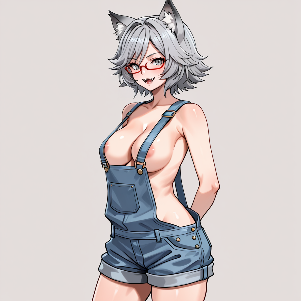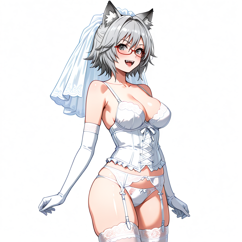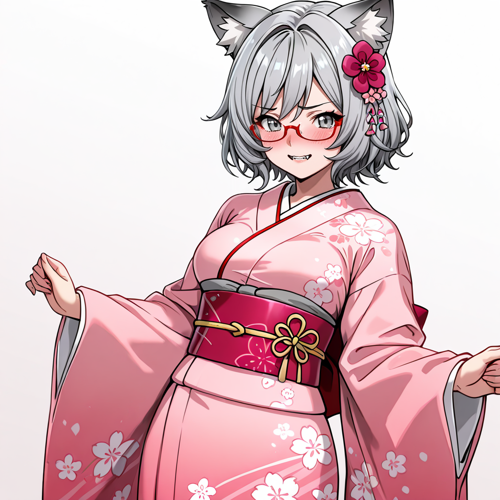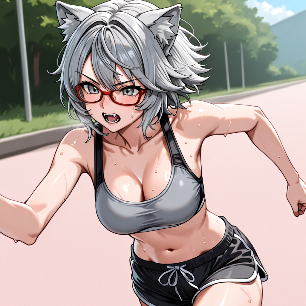 • トリガー: YukiOJ, 1girl, animal ears, red-framed eyewear, grey skirt, red necktie, grey hair, white shirt, medium breasts, short hair, fangs, school uniform, grey eyes, pantyhose, short sleeves, collared shirt, animal ear fluff