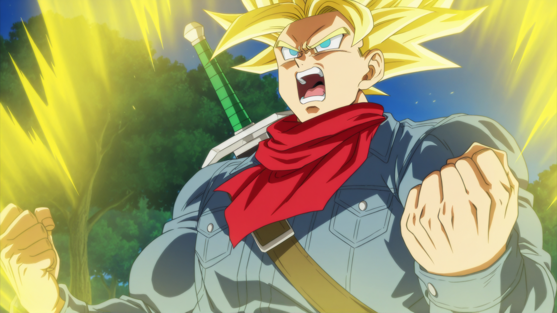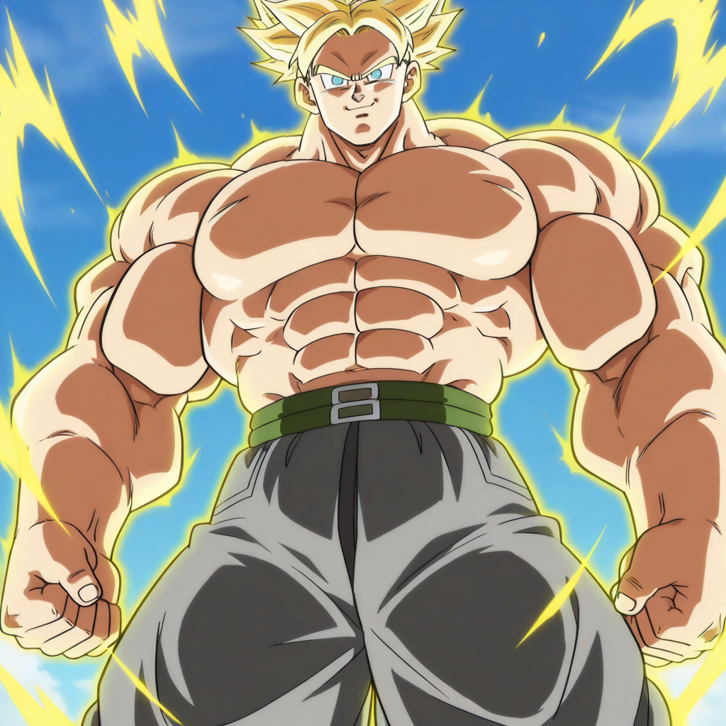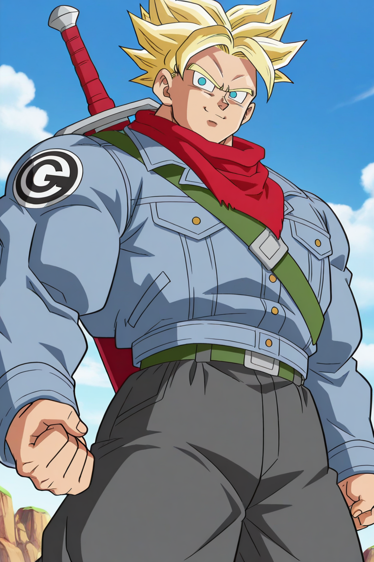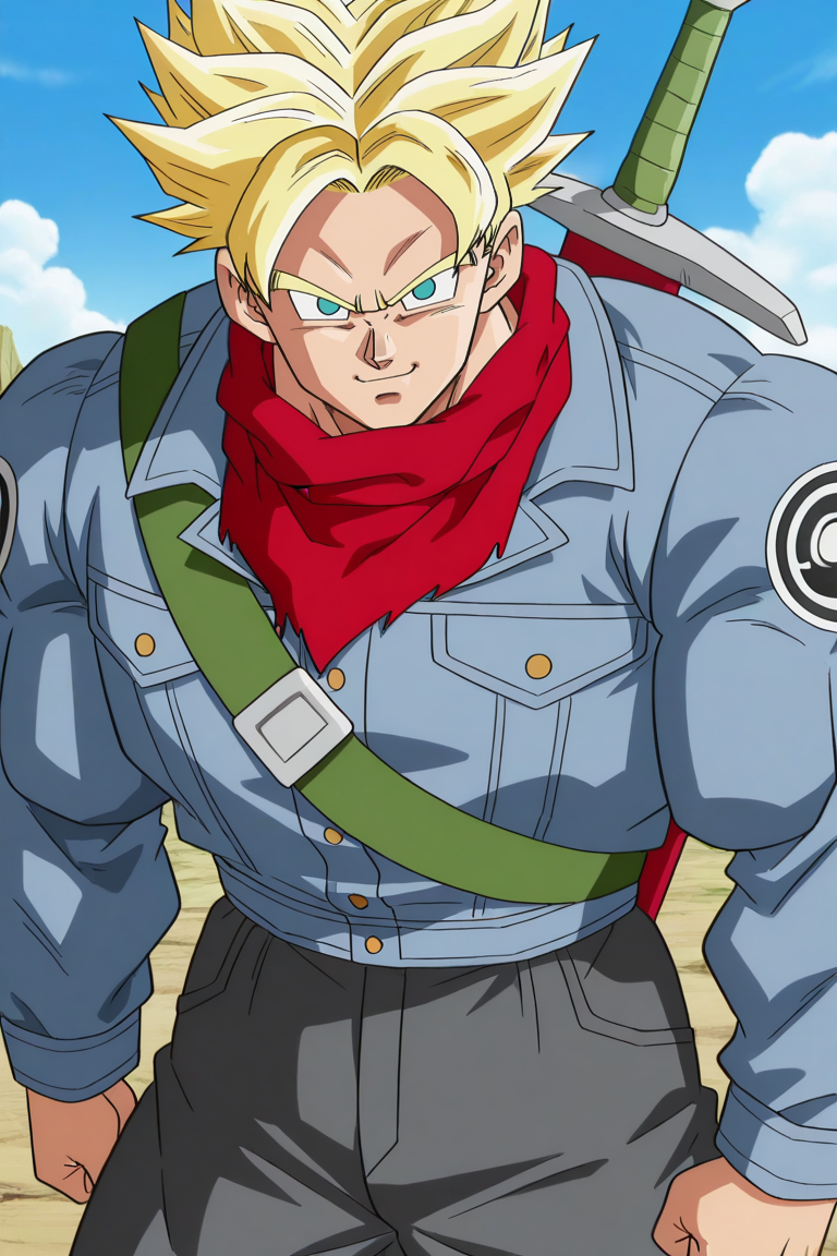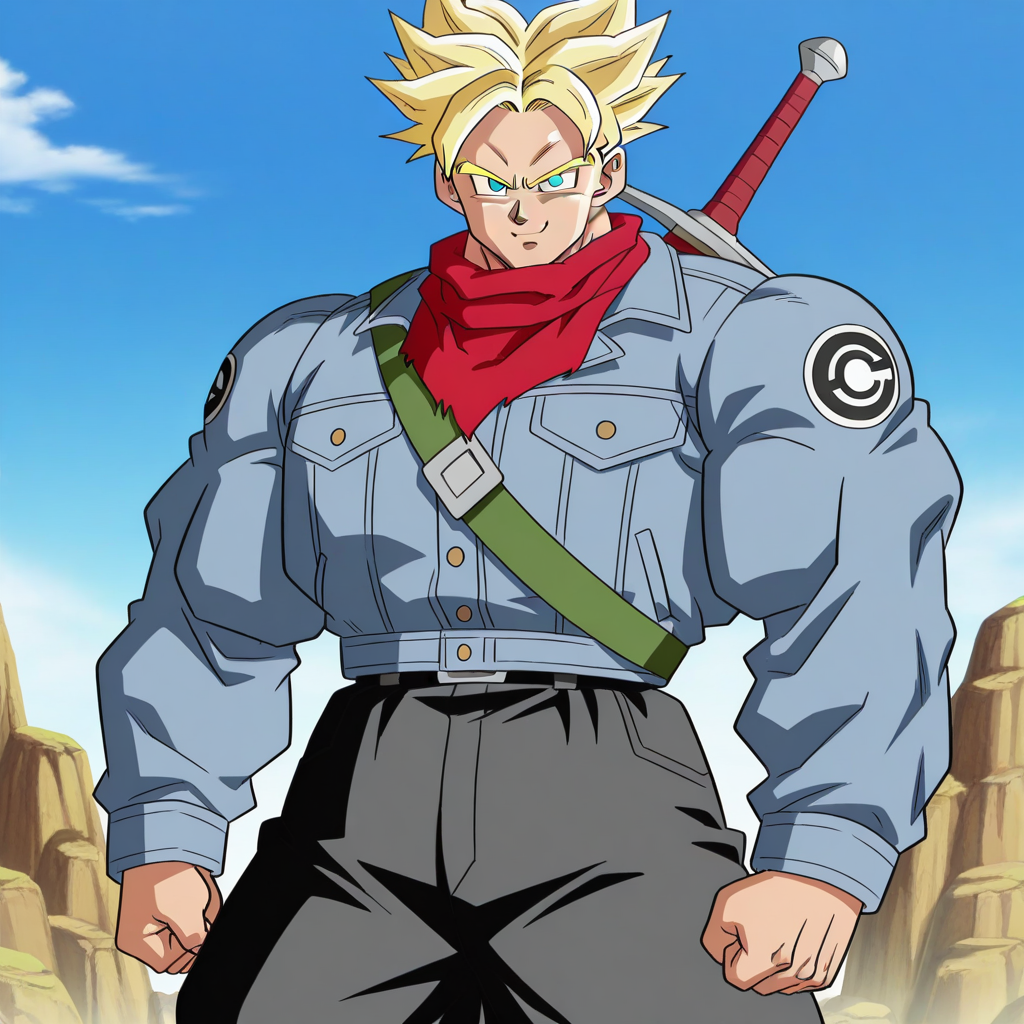 SSGTTSSRDBSFutureTrunks,1boy,spiked hair, yellow hair, super saiyan, blue eyes, no pupils, red scarf, denim jacket, long jacket sleeves, long sleeves, sword, weapon, sword on back,dark gray pants, olive green boots with a black toe cap, boots, very muscular,(big muscles: 1.5),wide body, wide back, smiling, solo,