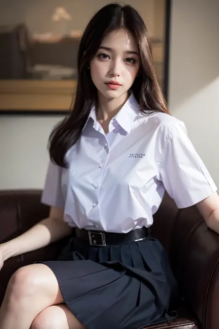 트리거 단어: (mathayom uniform), 흰색 셔츠 반팔, (검정색 주름 스커트 긴 바지), 벨트 사용 여부는 선택 사항