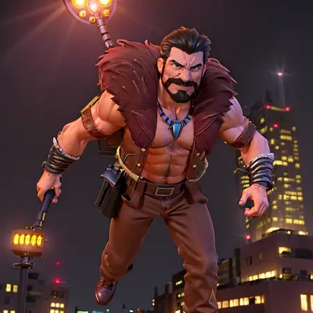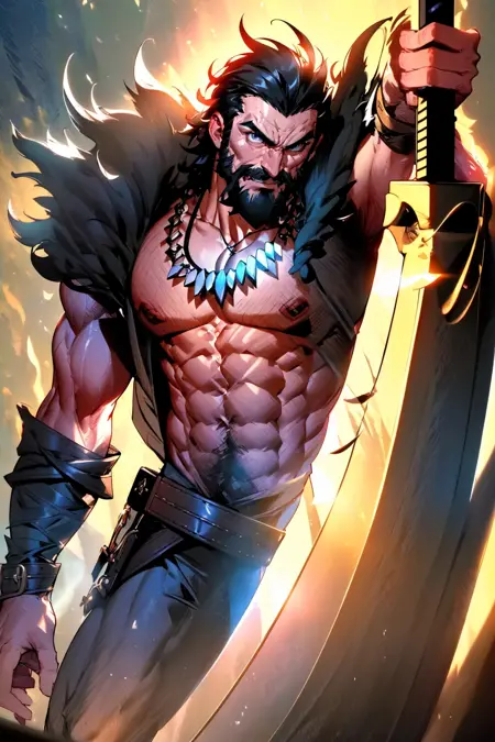 Trigger : 1boy, male focus, solo, facial hair, black hair, muscular, beard, abs, manly, necklace, mustache