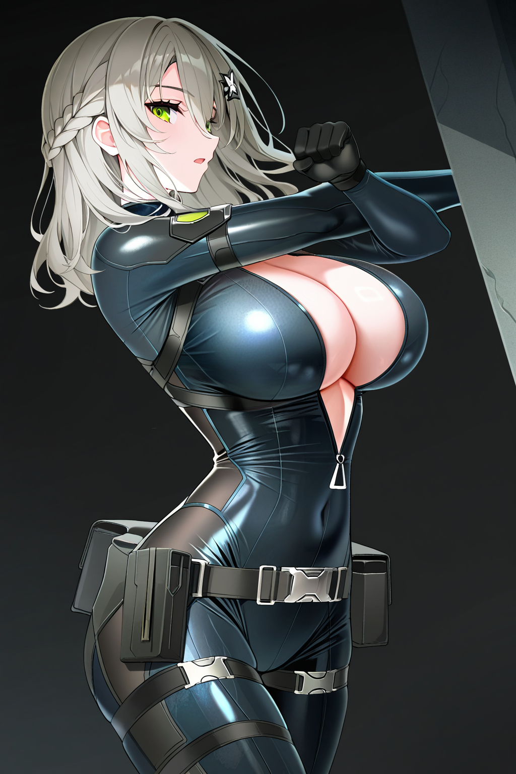 lnb_bds, 長い髪, 編み込み, 目の間の髪, sw_leenabi, 1girl, solo, 緑の目, 大きな胸, 灰色の髪, ヘアクリップ, 黒いボディスーツ, 中央開き, 胸元, ポーチ, ベルト, 黒い靴,