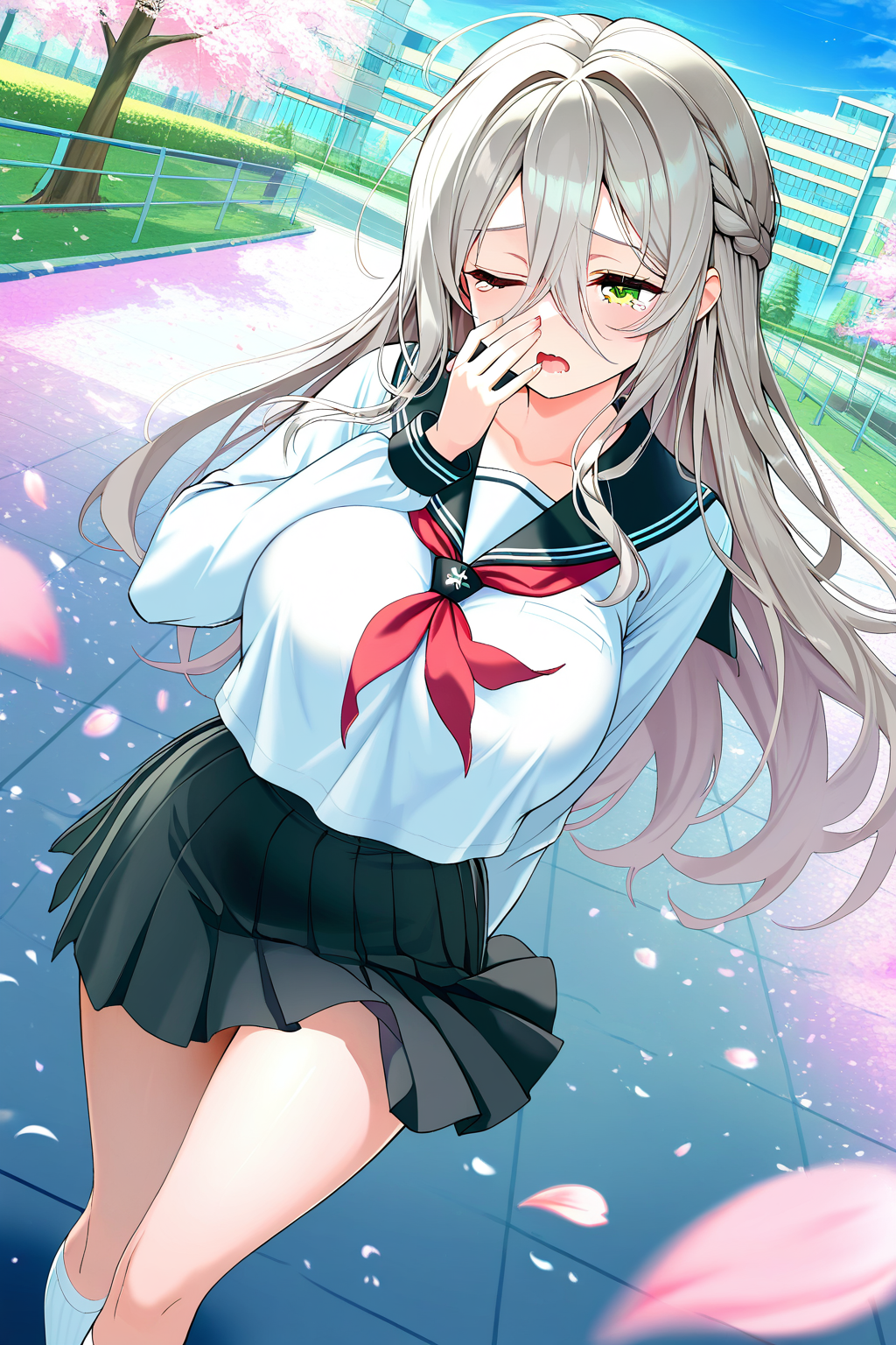 lnb_std, 長い髪, 編み込み, 目の間の髪, sw_leenabi, 1girl, solo, 緑の目, 大きな胸, 灰色の髪, 学校制服, 黒いセーラー collar, 赤いネッカチーフ, 白いシャツ, 長い袖, 黒いプリーツスカート, 白い膝上ストッキング, 黒いローファー,