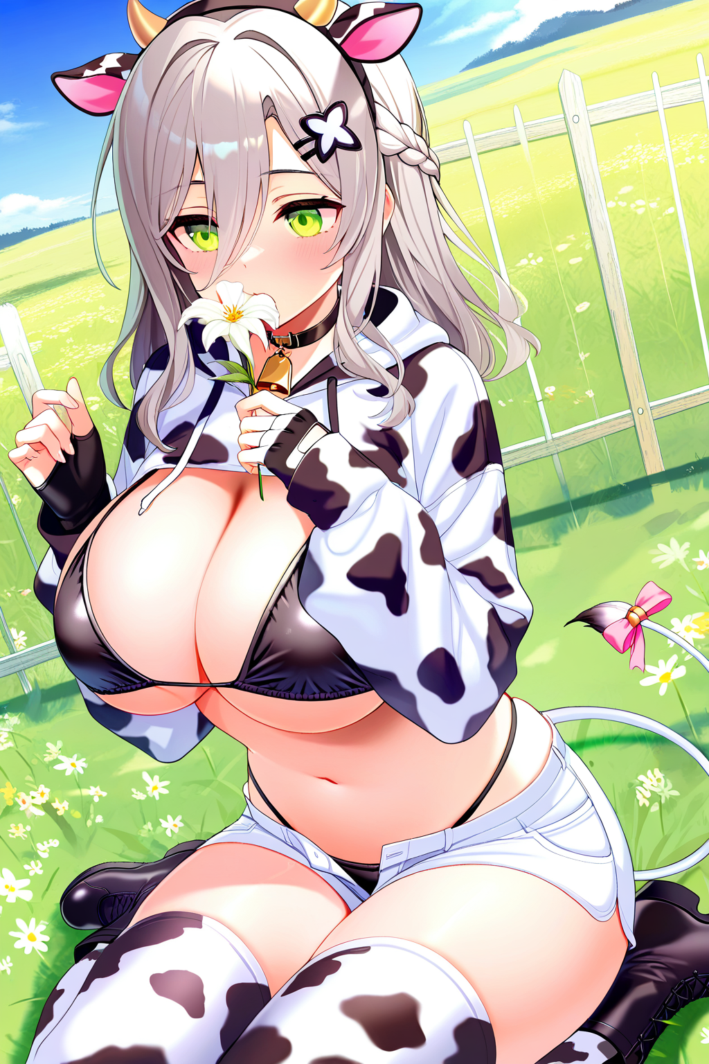 lnb_cow, 長い髪, 編み込み, 胸元, sw_leenabi, 1girl, solo, 緑の目, 大きな胸, 灰色の髪, ヘアクリップ, 黒いチョーカー, 長い袖, 黒いストリングビキニ, 黒いハイレグビキニ, 脇腹, カウプリント, フーディ, 指なし手袋, 白いマイクロショーツ, サイハイ, 開いたファスナー, カウベル, カウの角, 偽のカウの耳, カウのしっぽ, ピンクのリボン, しっぽの装飾, ブーツ,