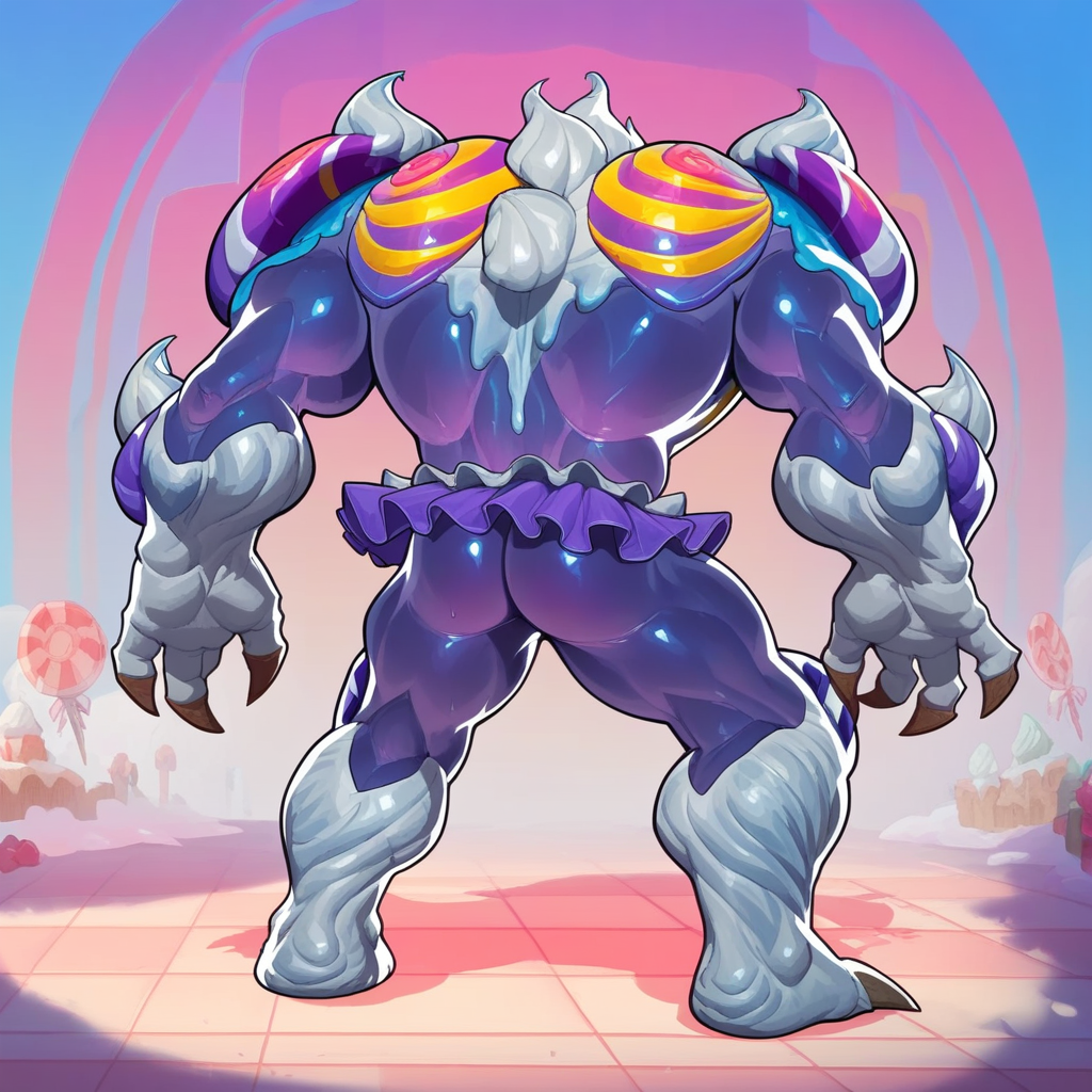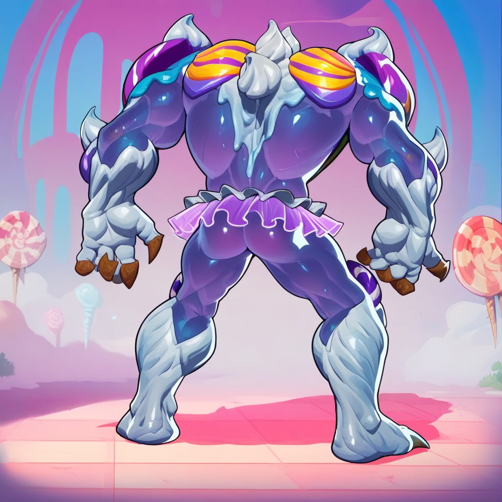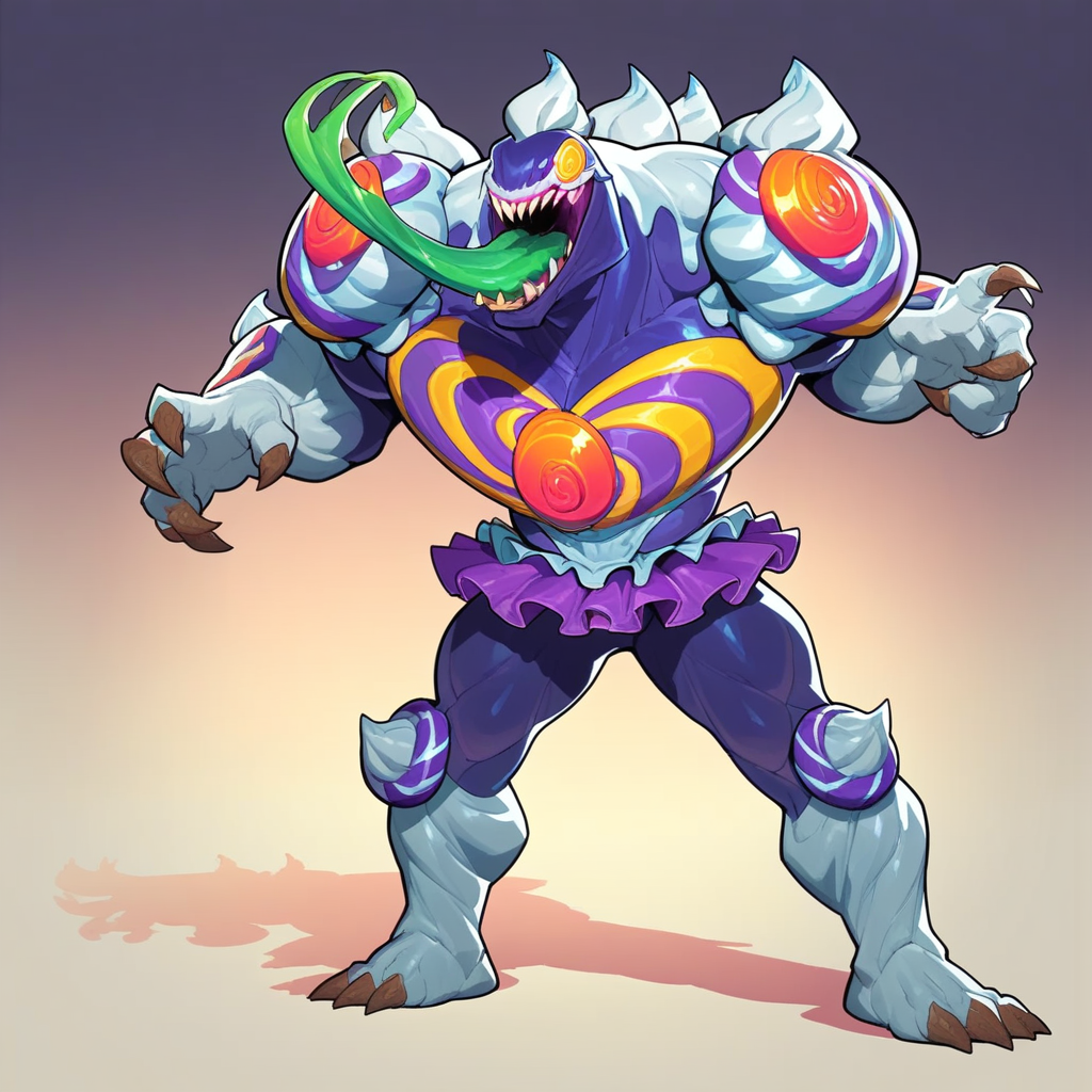 Gummy-Venom, purple skin, whipped cream hair, yellow eyes, sharp teeth, candy armor, purple skirt, little skirt, ice cream cone claws, candy chestplate, candy shoulder armor, candy kneepads, thick thighs, thick biceps