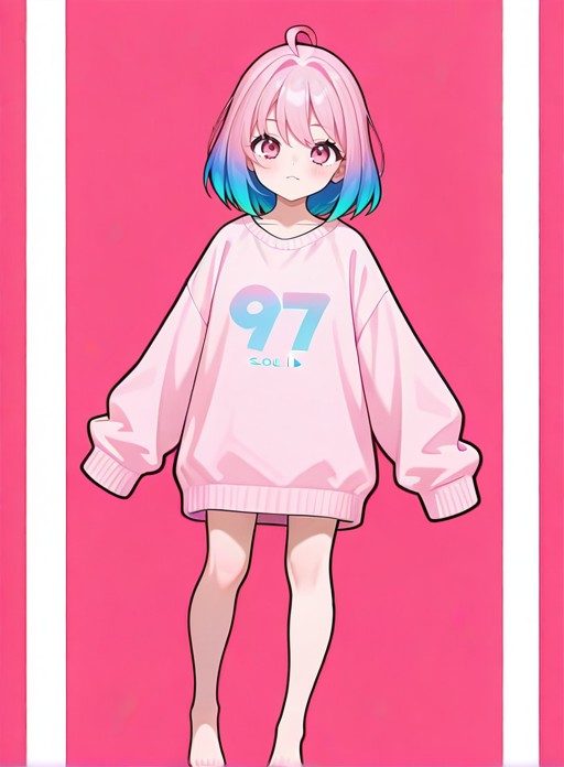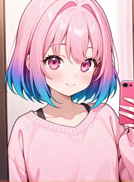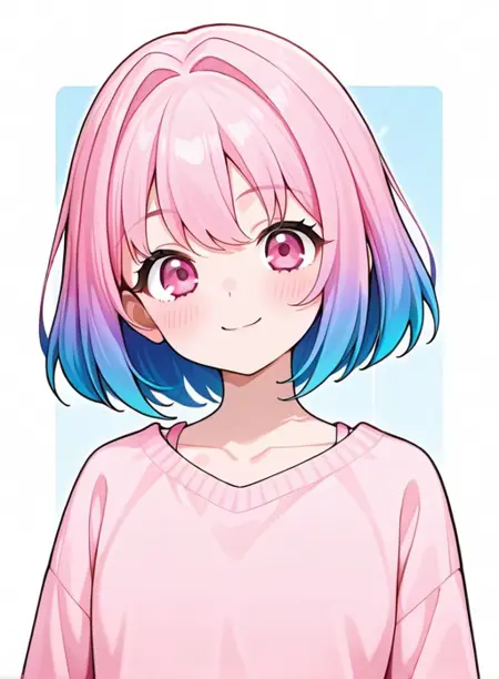 kohAI, 단발머리, 셔츠, 긴 소매, 파란 머리, 어깨뼈, 상체, 분홍 머리, 다색 머리, 중간 길이 머리, 분홍 눈, 이색 머리, 그라데이션 머리, 머리 끝, 볼륨 커트