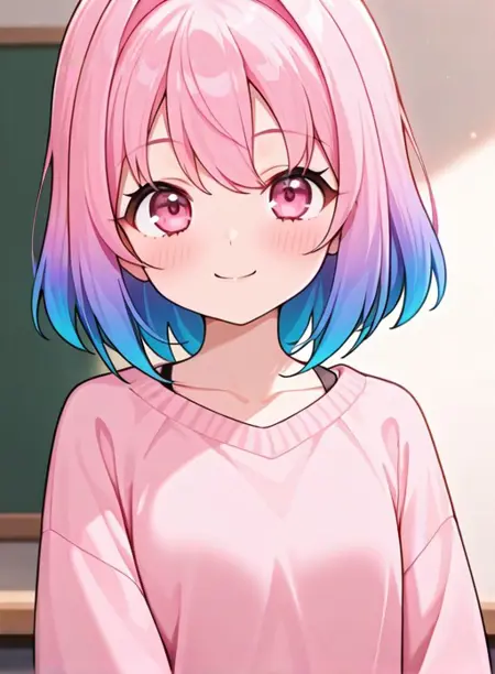 kohAI, short hair, shirt, long sleeves, blue hair,, collarbone, upper body, pink hair, multicolored hair, medium hair, pink eyes, , two-tone hair, gradient hair, hair intakes, bob cut