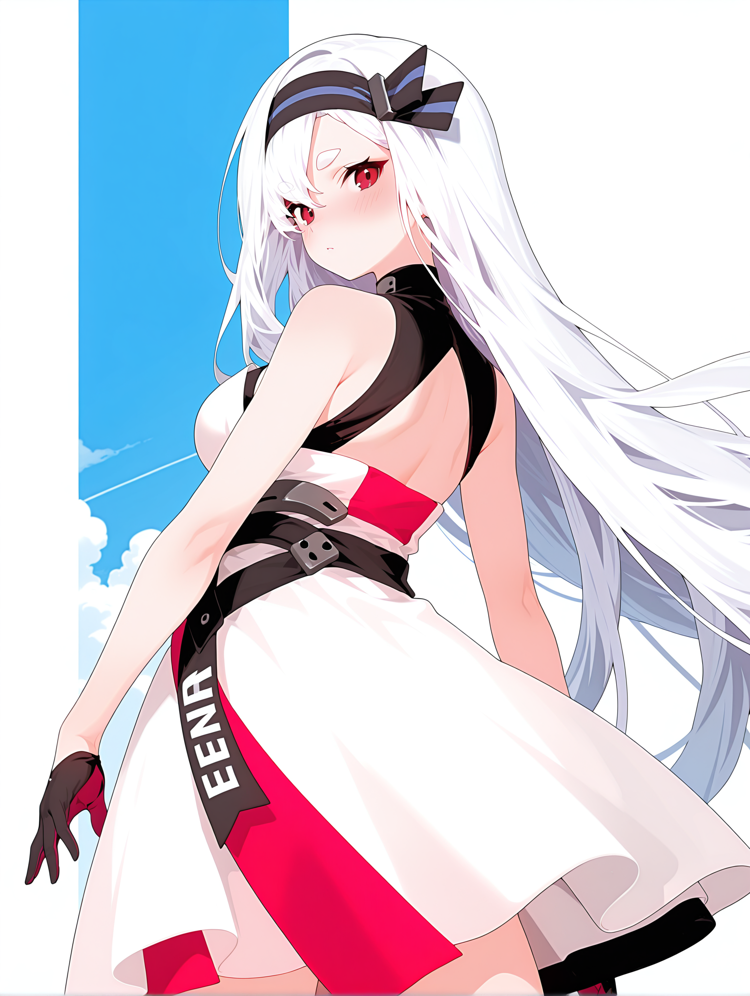 유니폼: e_clothes, 재킷, 어깨 노출, 소매 없음, 다색 옷, 옷에 글자, 장갑, 드레스, 검은 신발,