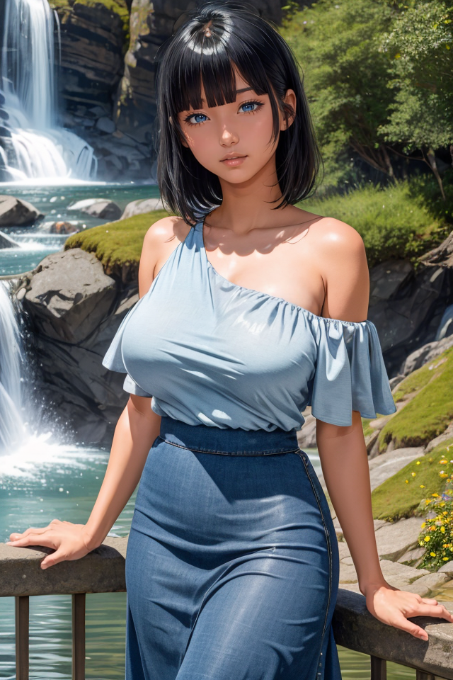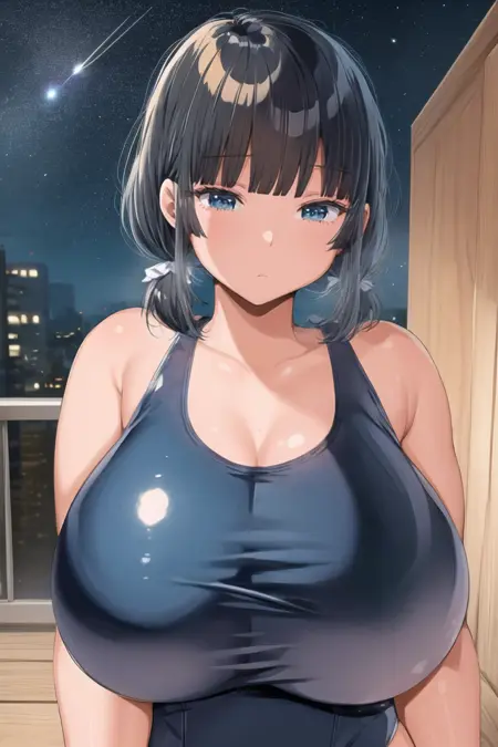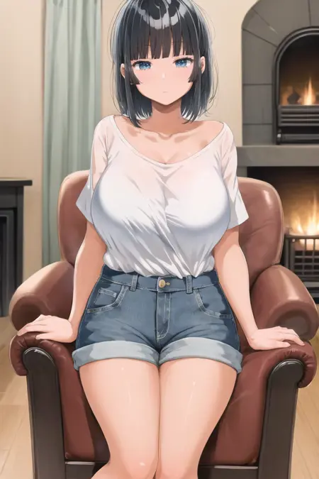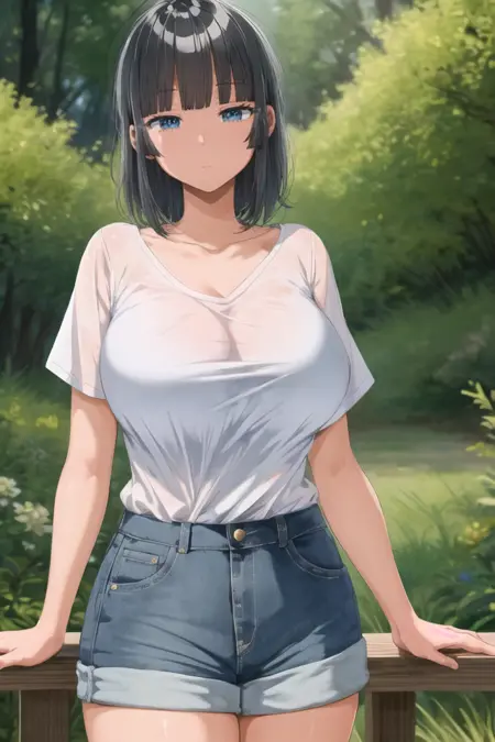 옵션 가이드 단어: 검은 머리, 파란 눈, 중간 길이 머리, 큰 가슴