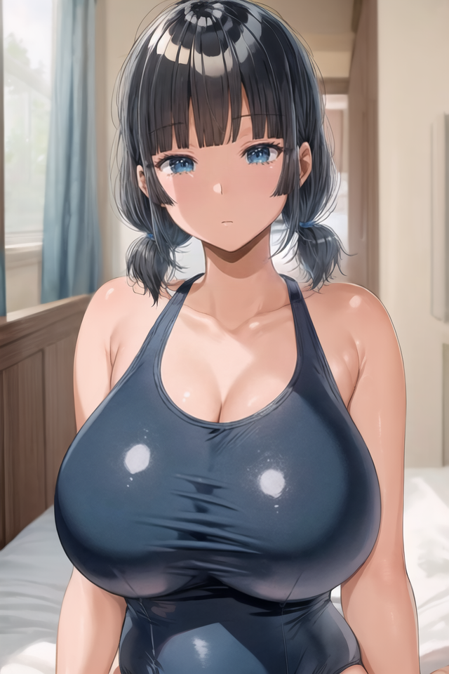 짧은 트윈테일, 학교 수영복, 원피스 수영복, 파란 수영복