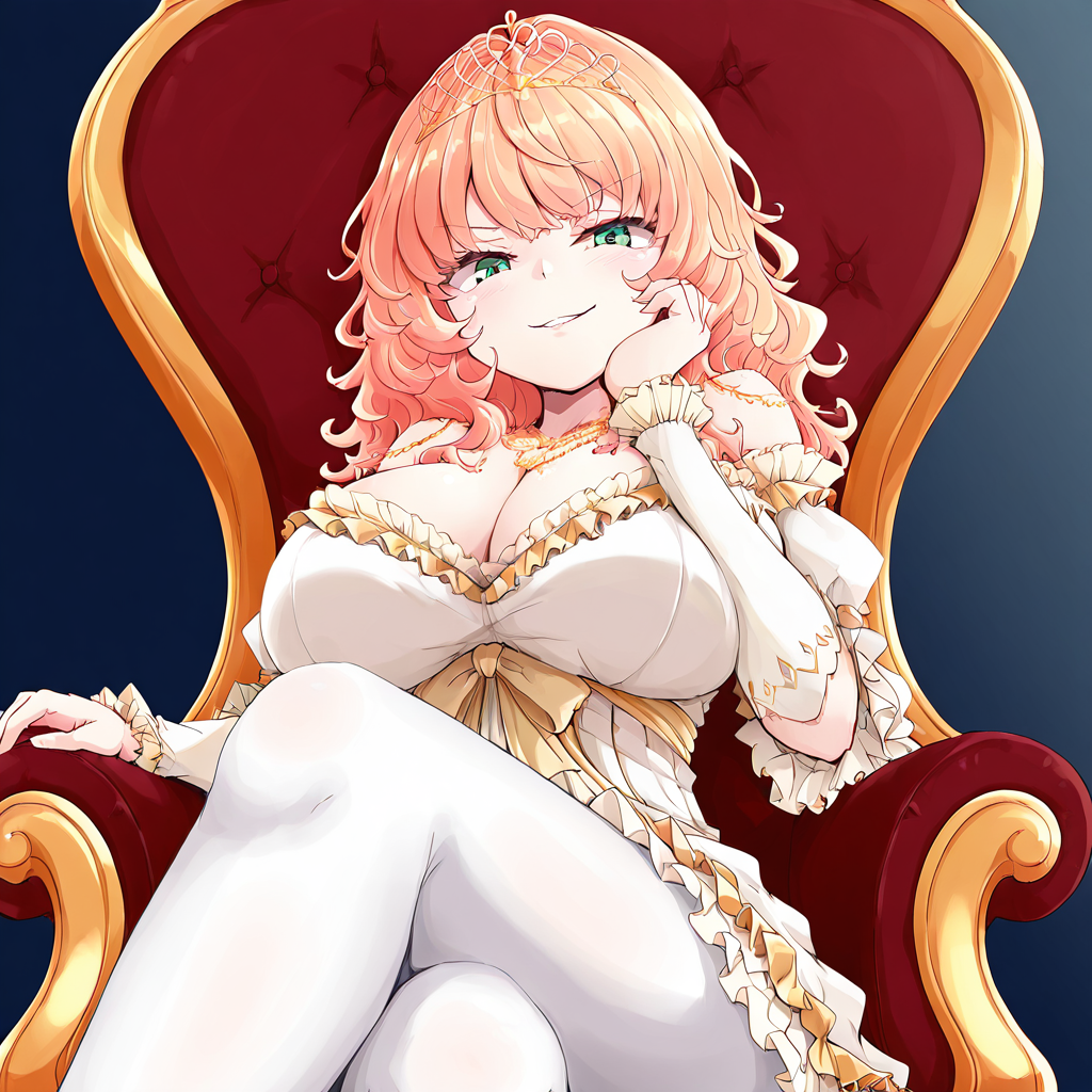 Remina, light orange hair, long hair, bangs, wavy hair, big breasts, green eyes, golden tiara,