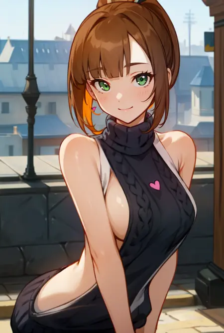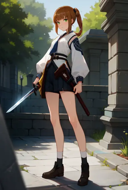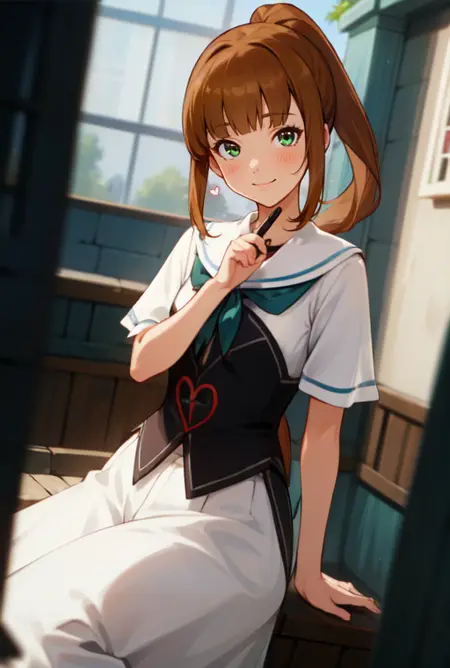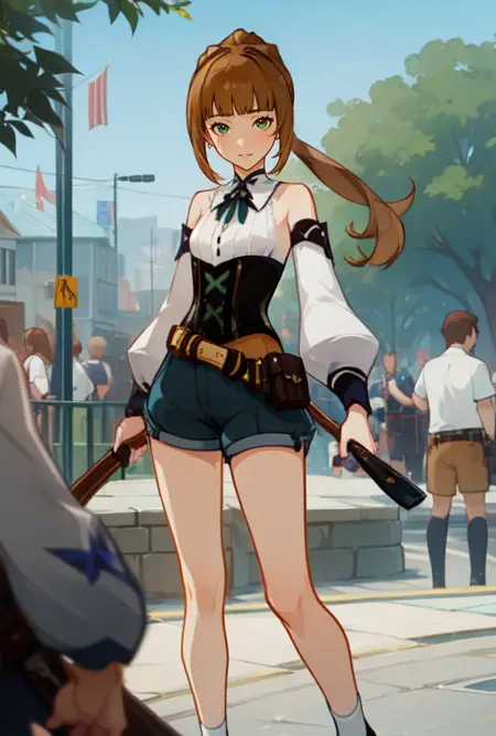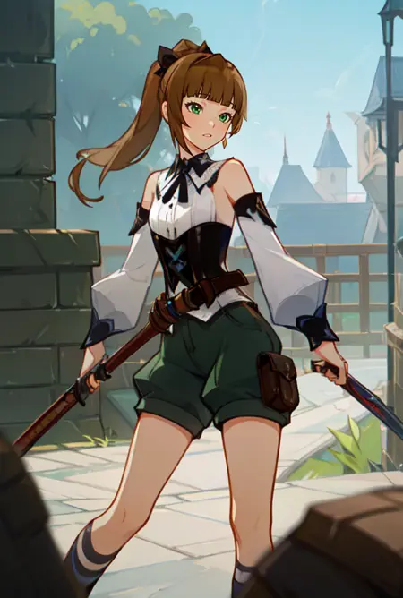 (masterpiece, best quality),(depth) of (field), lora:Ellin_GenshinImpactNPC:0.8 green_eyes, brown_hair, detached_sleeves, blunt_bangs, pony_tail, corset, belt, white_shirt, shorts, smile, heart, adult