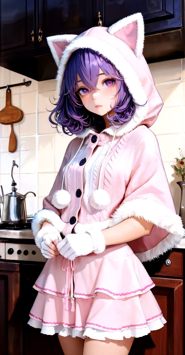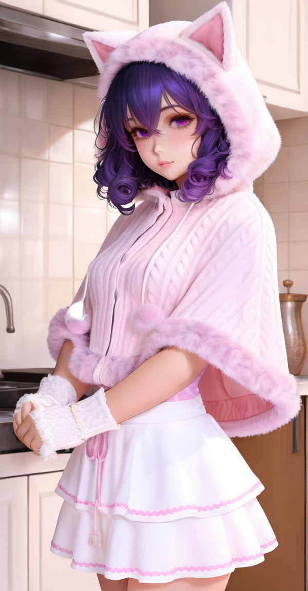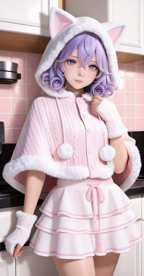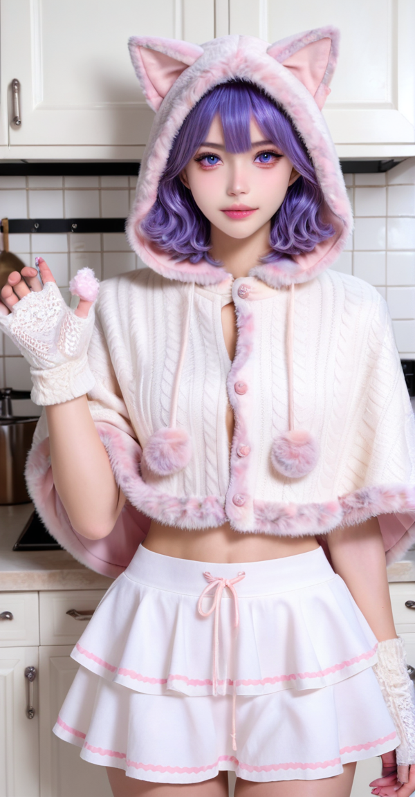 light pink knit cape, xg1, cat-ear hood, fluffy trim, white ruffled skirt, pink piping, fluffy gloves, white gloves