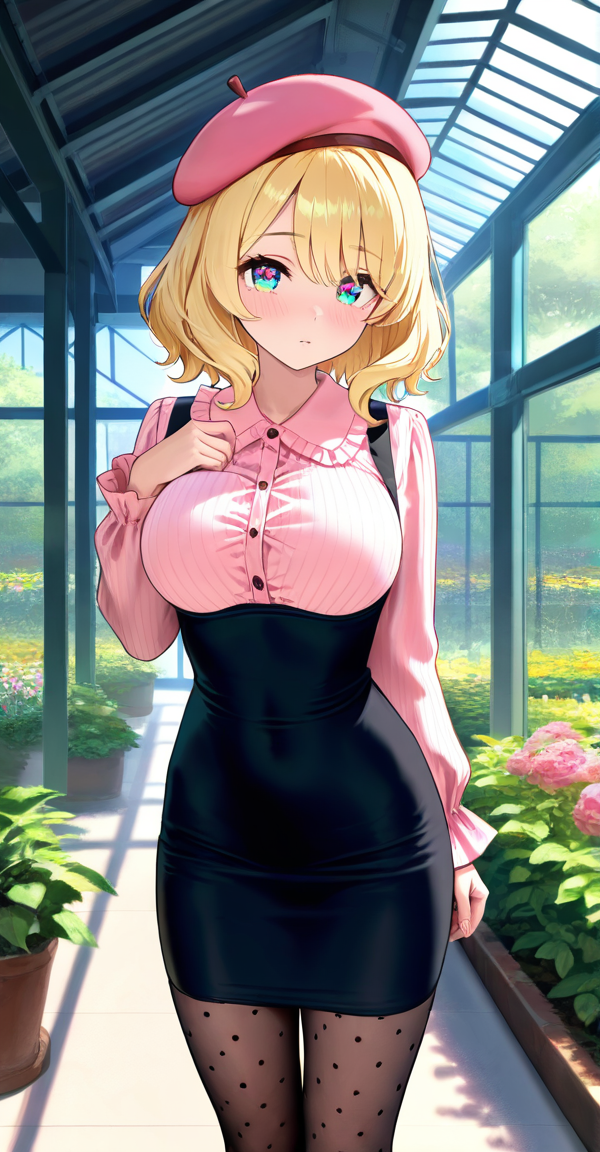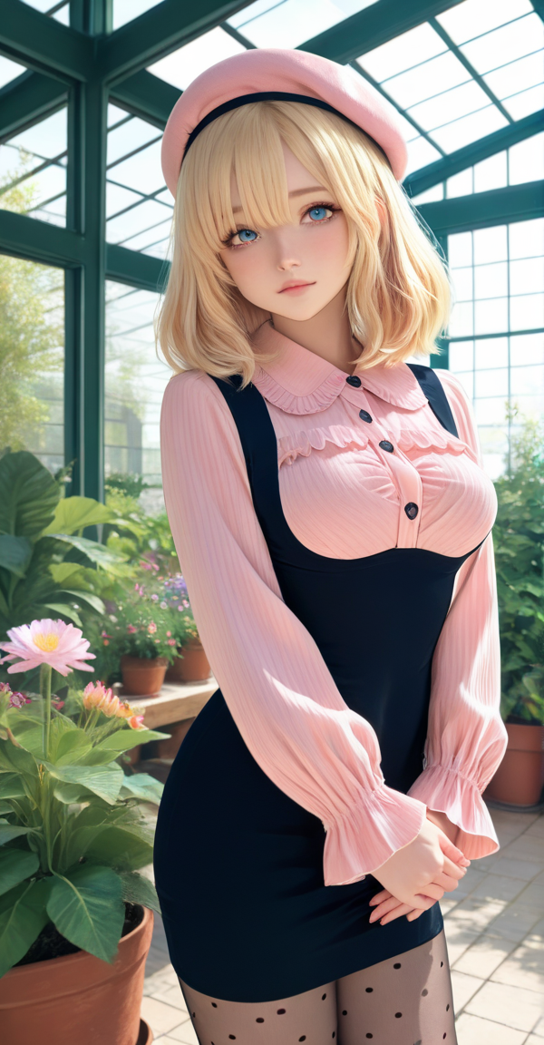 xg1, long sleeves, black high-waist tight mini suspender dress, black sheer polka-dot stockings, pink beret, pink frilly heart-button blouse and puffed long sleeves