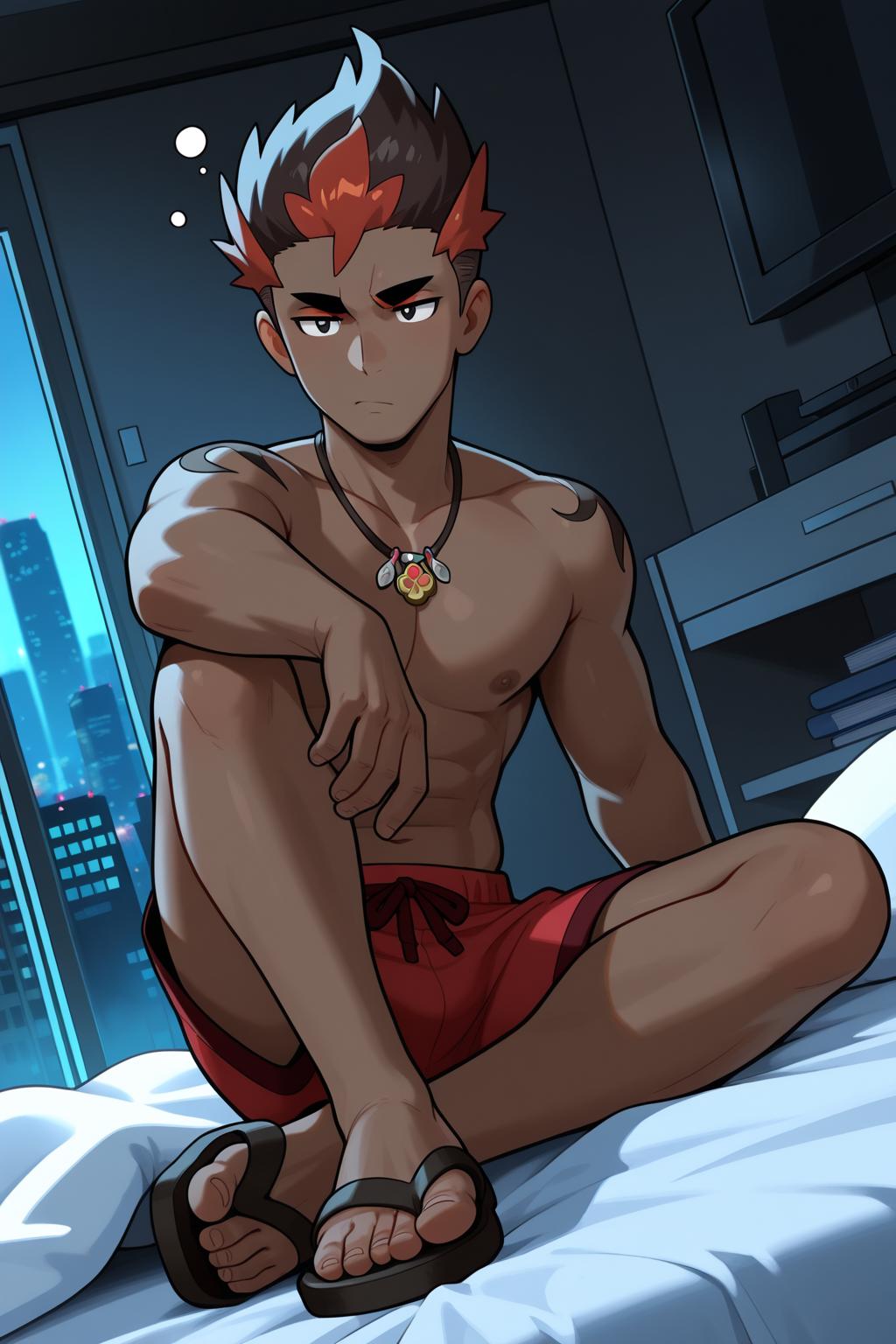 빨간 반바지, 샌들, 목, 목걸이