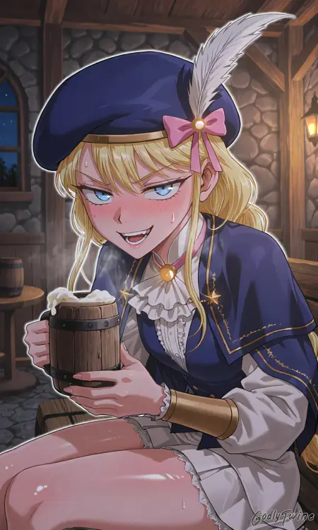 Arua Raven, blue eyes, blonde hair, very long hair, braid over shoulder,