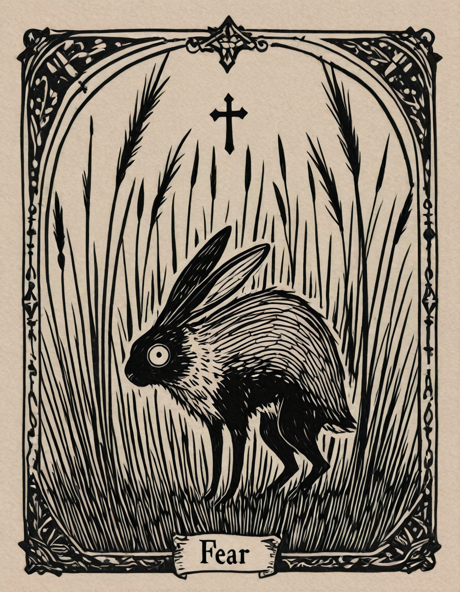 画像は古風で象徴的で、古い羊皮紙にシンプルなインクの線で描かれており、民芸的な人物、動物、物事が静かな意味を持っています。