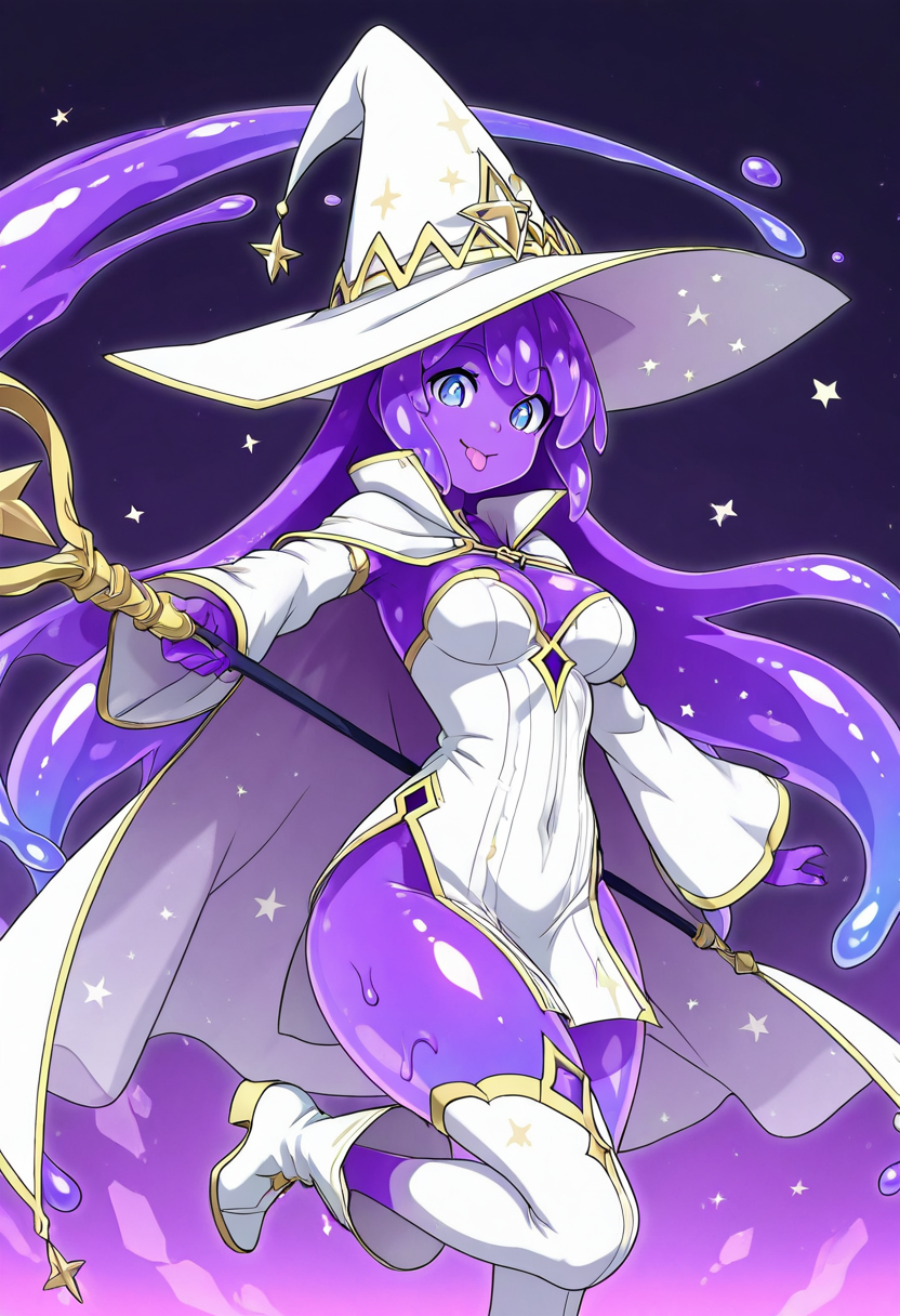 zzPlumhex, 1人娘, シングル, 長い髪, 前髪, 青い目, 長袖, 帽子, 非常に長い髪, 紫色の髪, ブーツ, 星(記号), ケープ, 透け, 女王の帽子, 色付き肌, 白い頭部装飾, 白い靴, モンスター娘, 杖, 骨盤カーテン, 紫色の肌, スライム娘, 透けたドレス