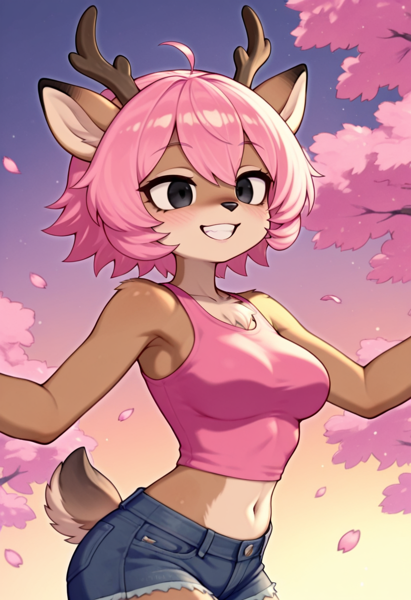zzSakurastag, 1人娘, シングル, 胸, 短い髪, 動物の耳, 中くらいの胸, へそ, 尾, ピンクの髪, ショートパンツ, 腹部露出, 黒い目, クロップトップ, 短いショートパンツ, タンクトップ, デニム, もふもふ, デニムショートパンツ, もふもふ女性, 角, 鹿の耳