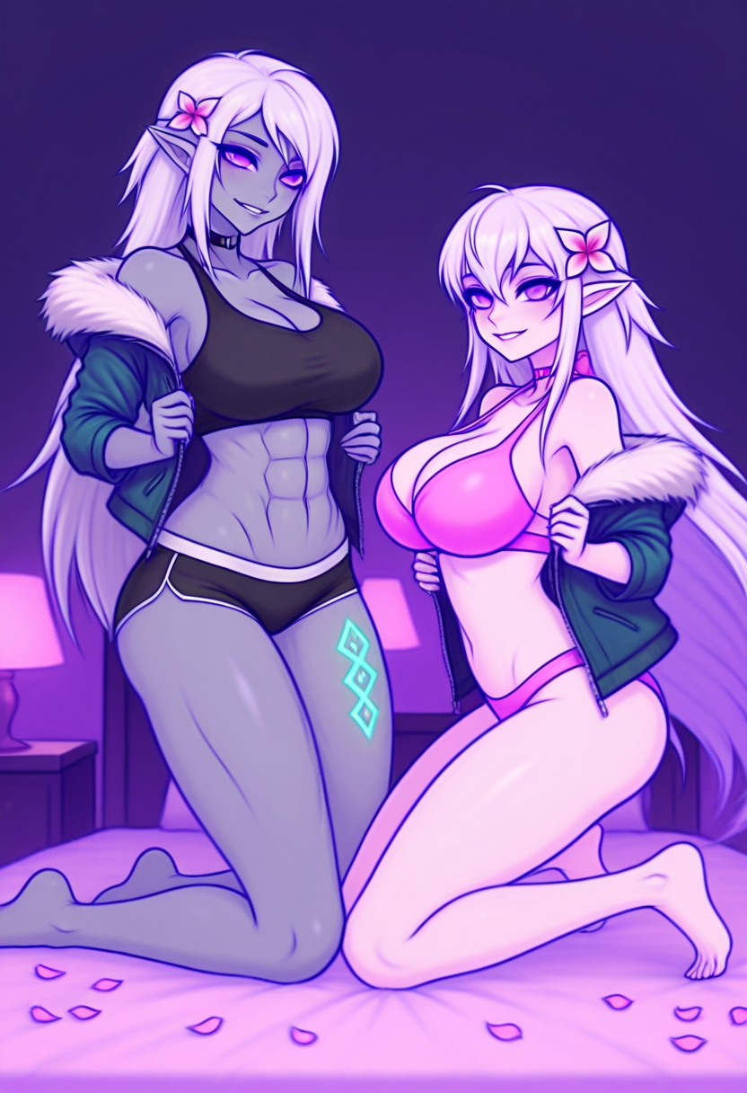 zzBloomveil, 1人娘, シングル, 長い髪, 胸, 大きな胸, 髪飾り, へそ, 胸元, 目の間の髪, 肩出し, 非常に長い髪, 下着, 紫色の目, 紫色の髪, 花, 白髪, 多色の髪, チョーカー, 尖った耳, 髪の花, ブラ, 腕出し, 脚出し, タトゥー, グラデーション髪, 色付き肌, 下着のみ, ピンクのパンツ, ピンクのブラ, ピンクのビキニ, 紫のブラ, 紫色の肌