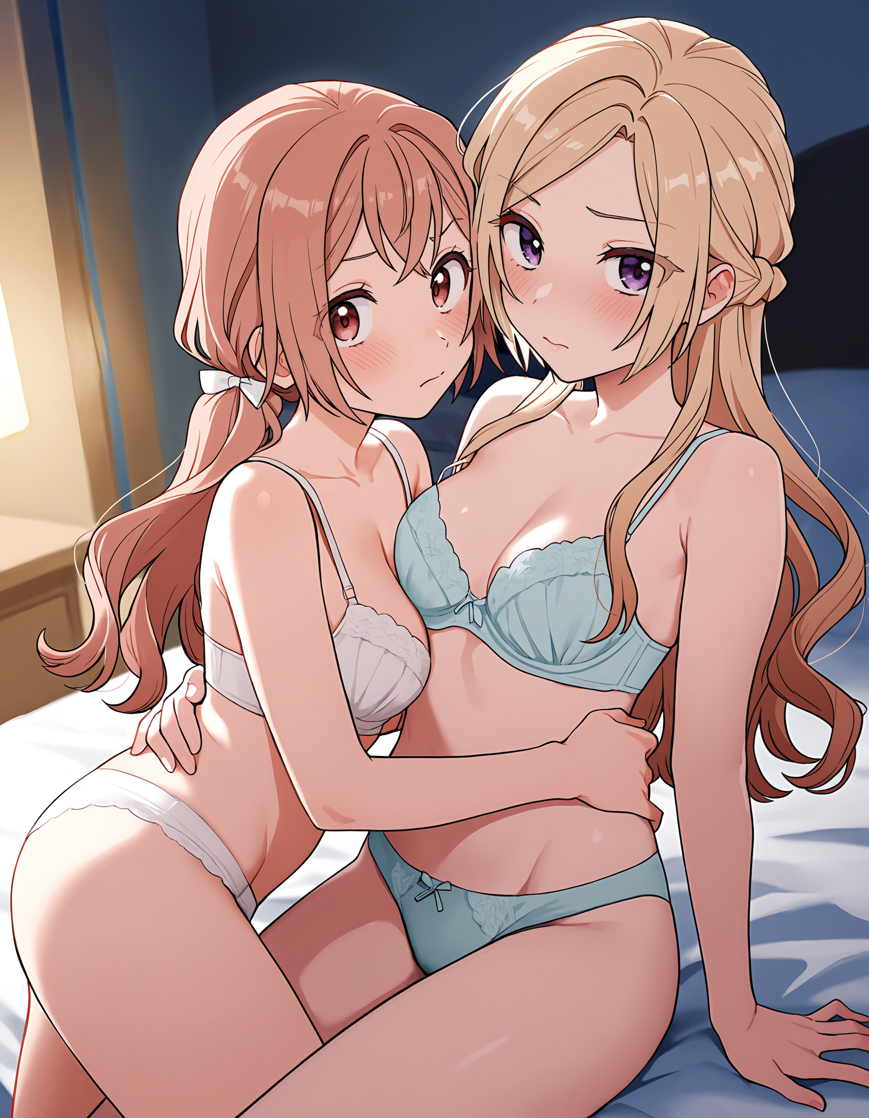 함께 생성하려면 긍정 프롬프트에 "2girls, multiple girls" 태그를 포함하고 부정 프롬프트에 "1girl, solo"를 추가하세요. 또한 "포옹하기, 키스하기"와 같이 두 캐릭터가 필요하는 액션 프롬프트를 추가하는 것도 도움이 됩니다.