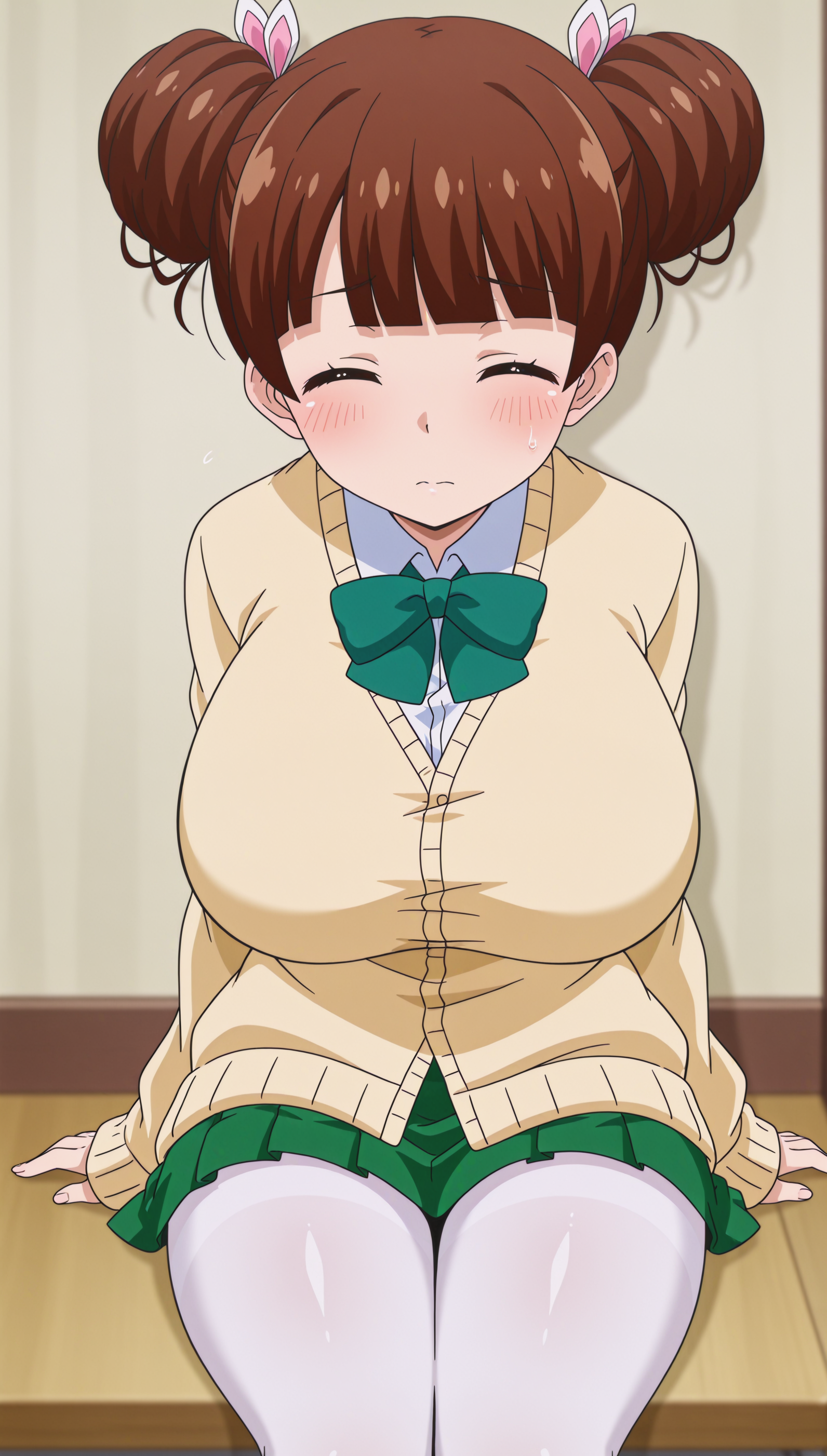 Nene Fujinoki: 白いパンティーストッキング、緑のスカート、制服、リボン、靴