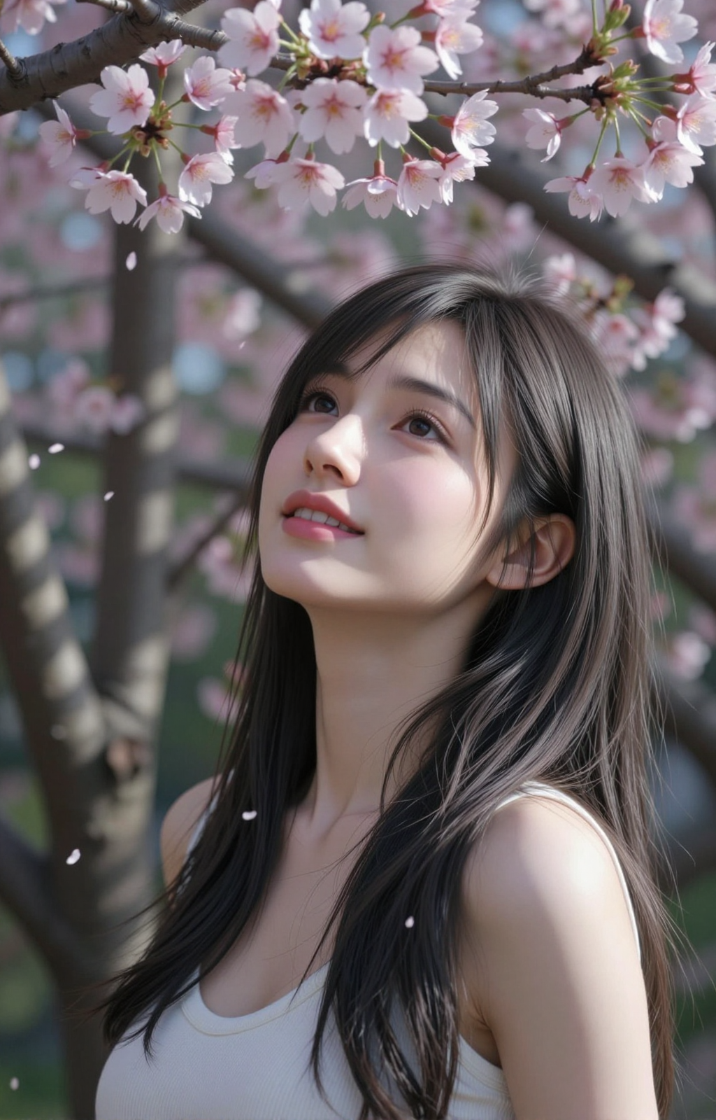 トリガー:zitti, flower, solo, holding flower, long hair, dress, black hair, white dress, hat, white headwear, holding, looking at viewer, white flower, blurry, bare shoulders, smile, blurry background, realistic, outdoors, brown eyes, sun hat, upper body, detached sleeves, strapless, breasts, lips, strapless dress