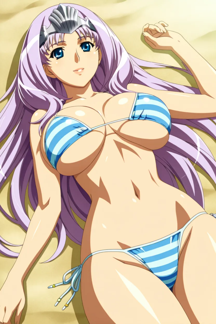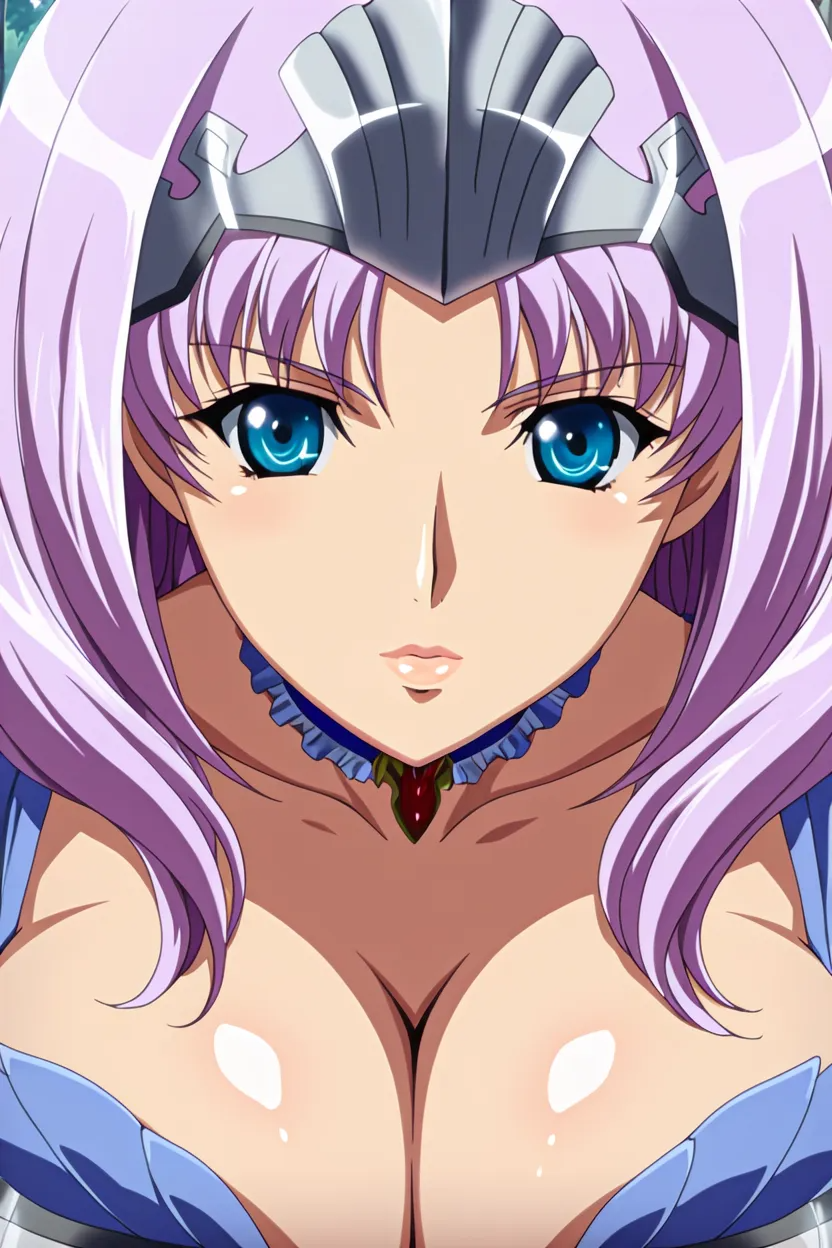 1girl, Annelotte (Q.B.R), light purple hair, long hair, blue eyes, glossy lips, thick lips, massive breasts, queens_blade_art_style, HD, 4k, High-resolution, Excellent-Quality, No-Flaws, clean animation