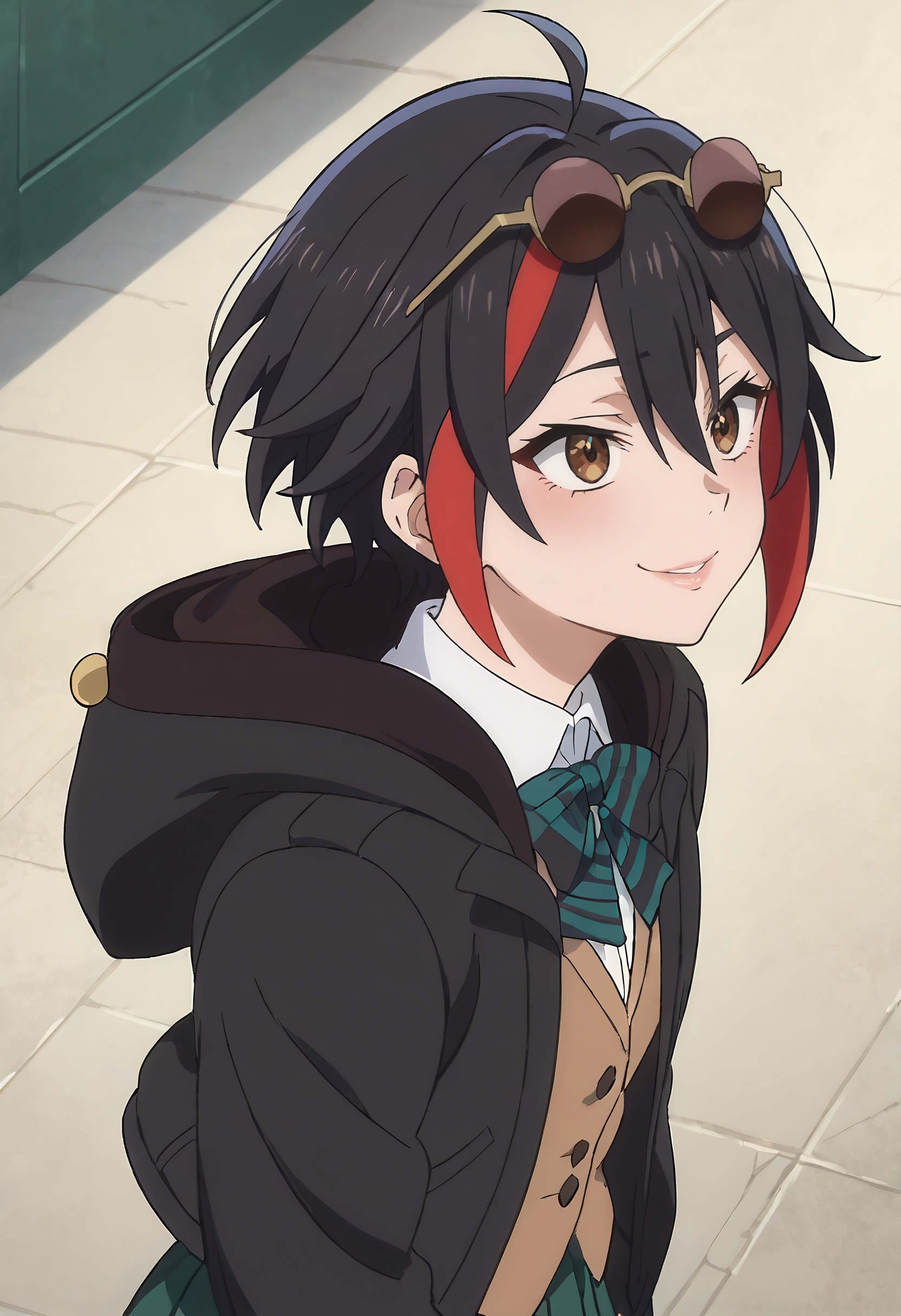 TakahashiSchool、頭に眼鏡、ジャケット、サングラス、フード、シャツ、リボン、フード付きジャケット、長袖、フードを下ろした状態、学校制服、ネクタイ、スカート、プリーツスカート、襟付きシャツ、白いシャツ、黒いジャケット、縞模様、緑のスカート、縞模様のリボン、茶色のベスト、