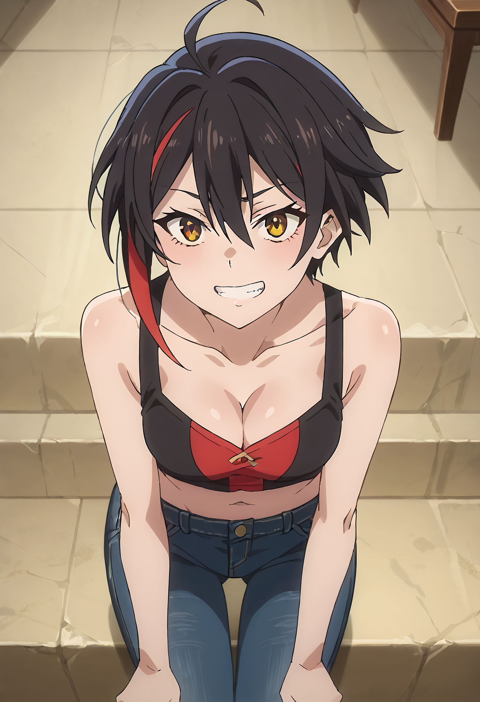 DL2Takahashi、黒髪、ショートヘア、あほ毛、マルチカラーの髪、茶色の目、赤髪、目の間の髪、前髪、ストライプ髪、色付きの内側の髪、