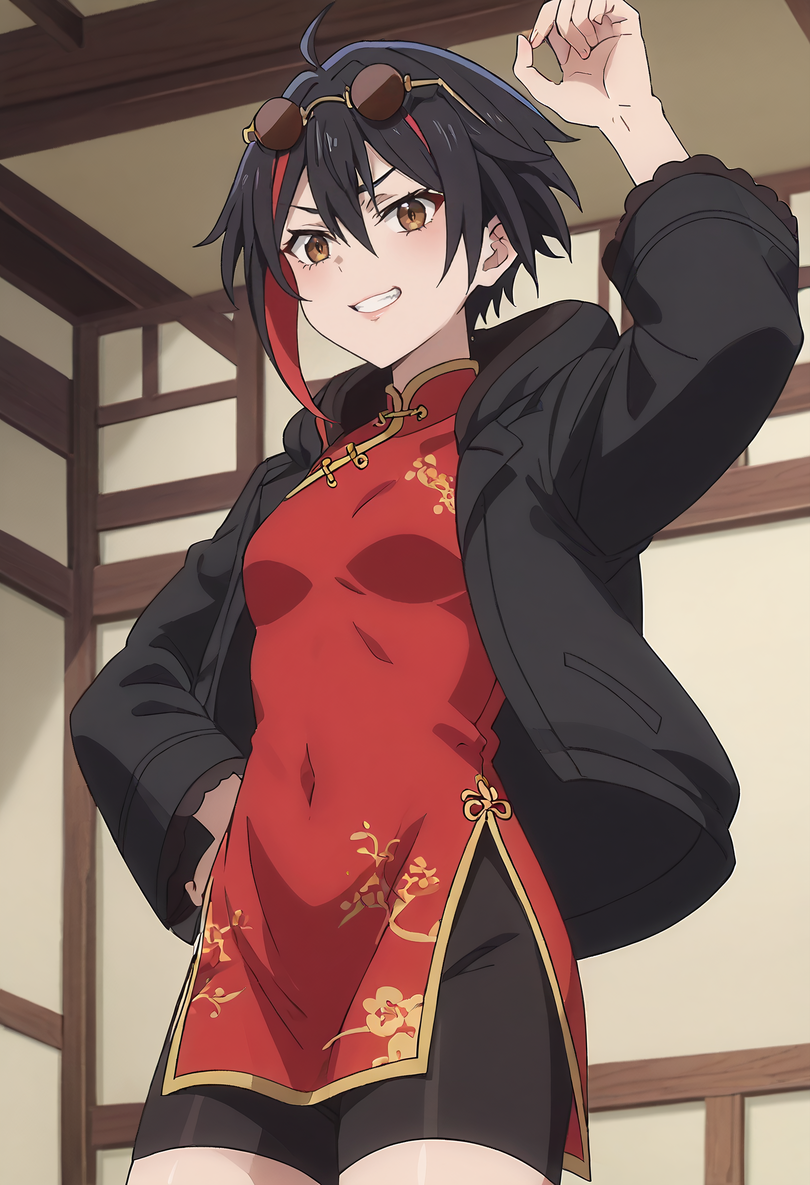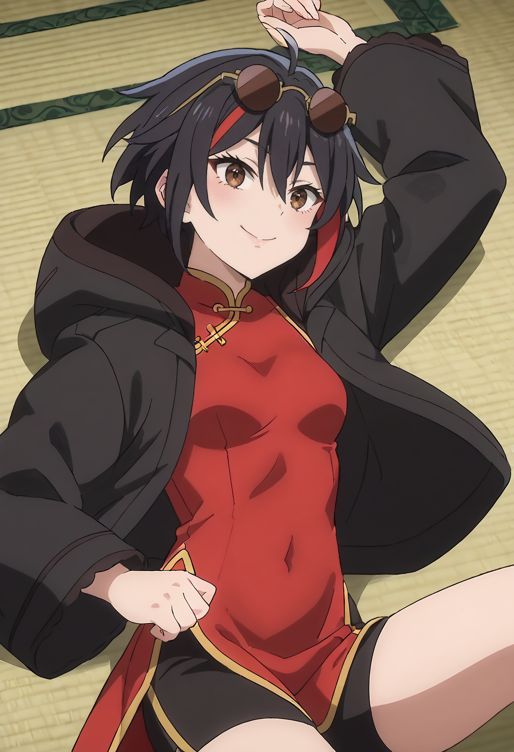 TakahashiJacket、頭に眼鏡、フード、サングラス、ジャケット、フードを下ろした状態、フード付きジャケット、チャイナドレス、長袖、畳、ドレス、赤いドレス、オープンな服、ショートパンツ、黒いジャケット、中国風の服、黒いショートパンツ、ドレスの下のショートパンツ、